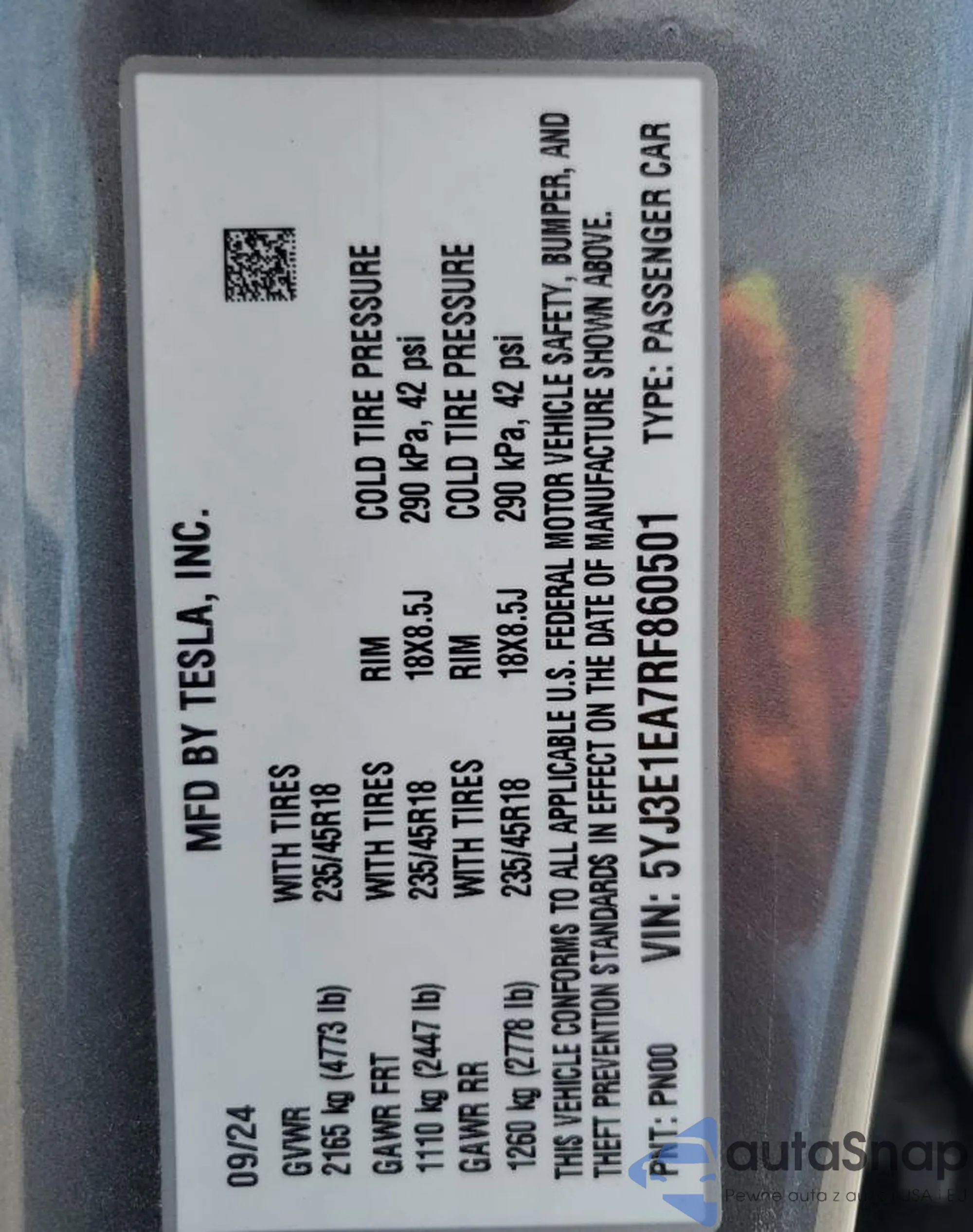 • VIN 5YJ3E1EA7RF860501