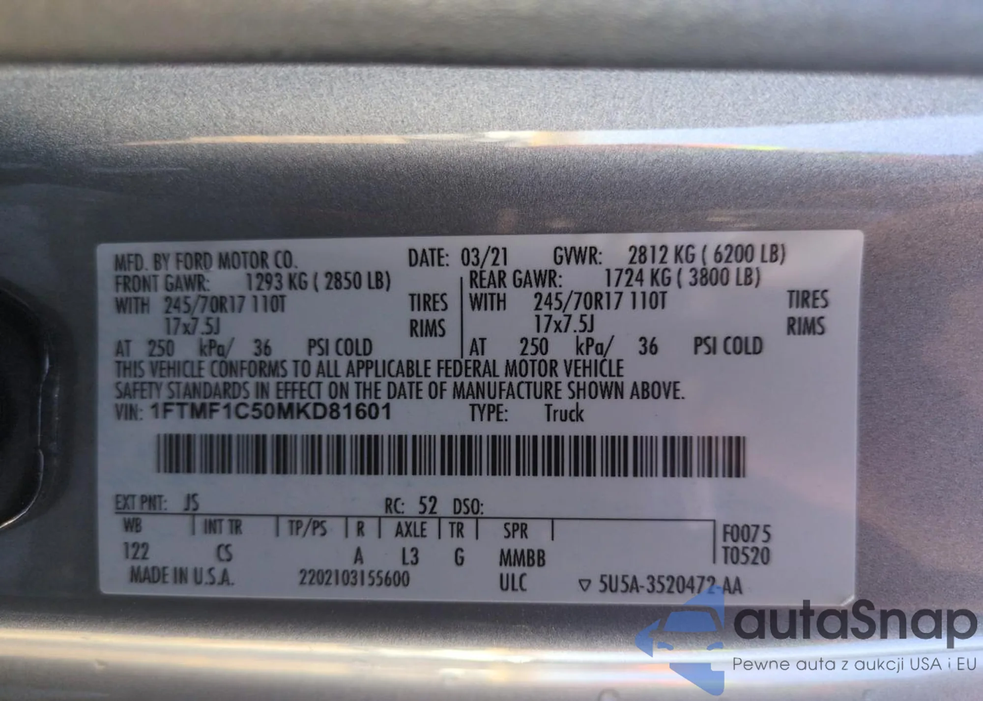 LOT: 49331765 VIN: 1FTMF1C50MKD81601