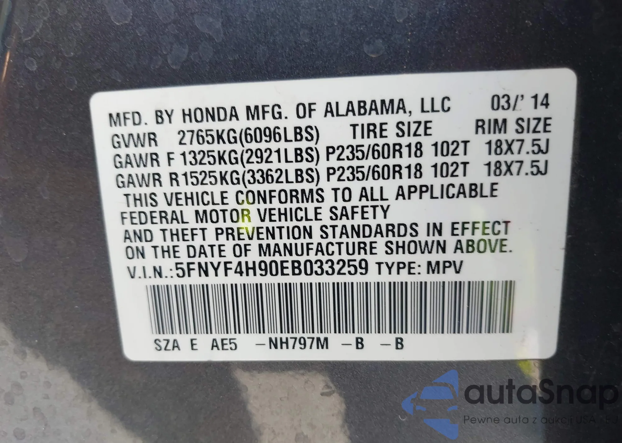 • VIN 5FNYF4H90EB033259