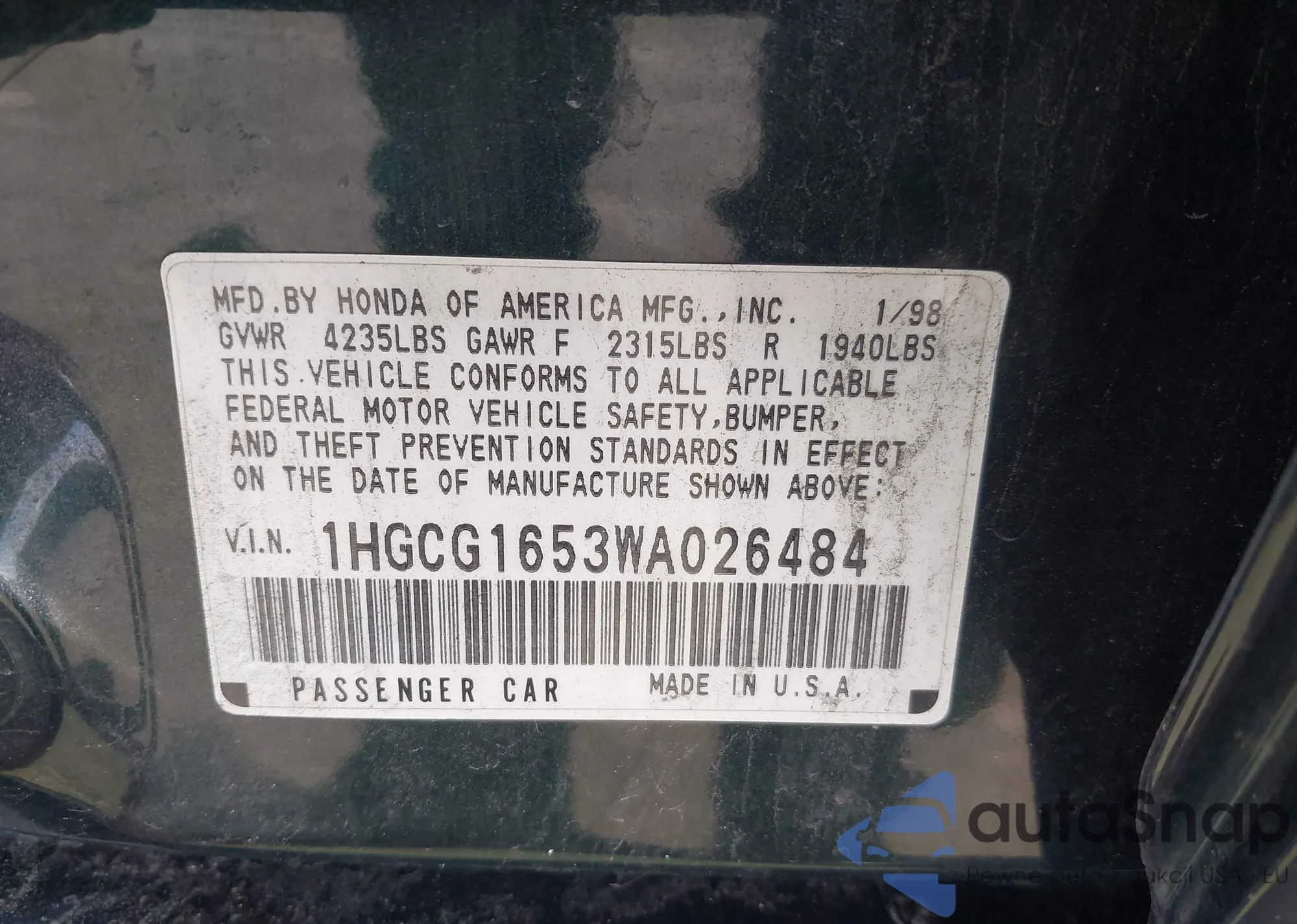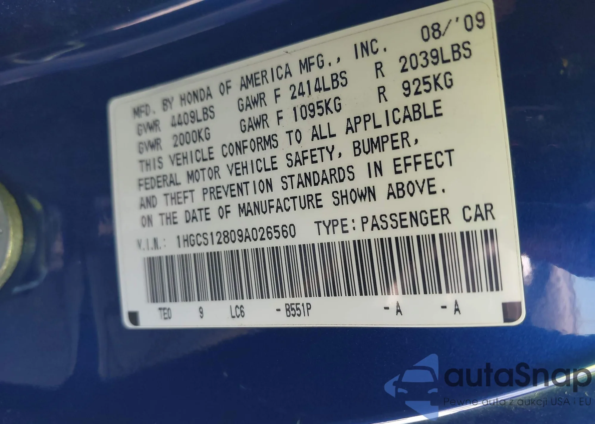 LOT: 40449329 VIN: 1HGCS12809A026560