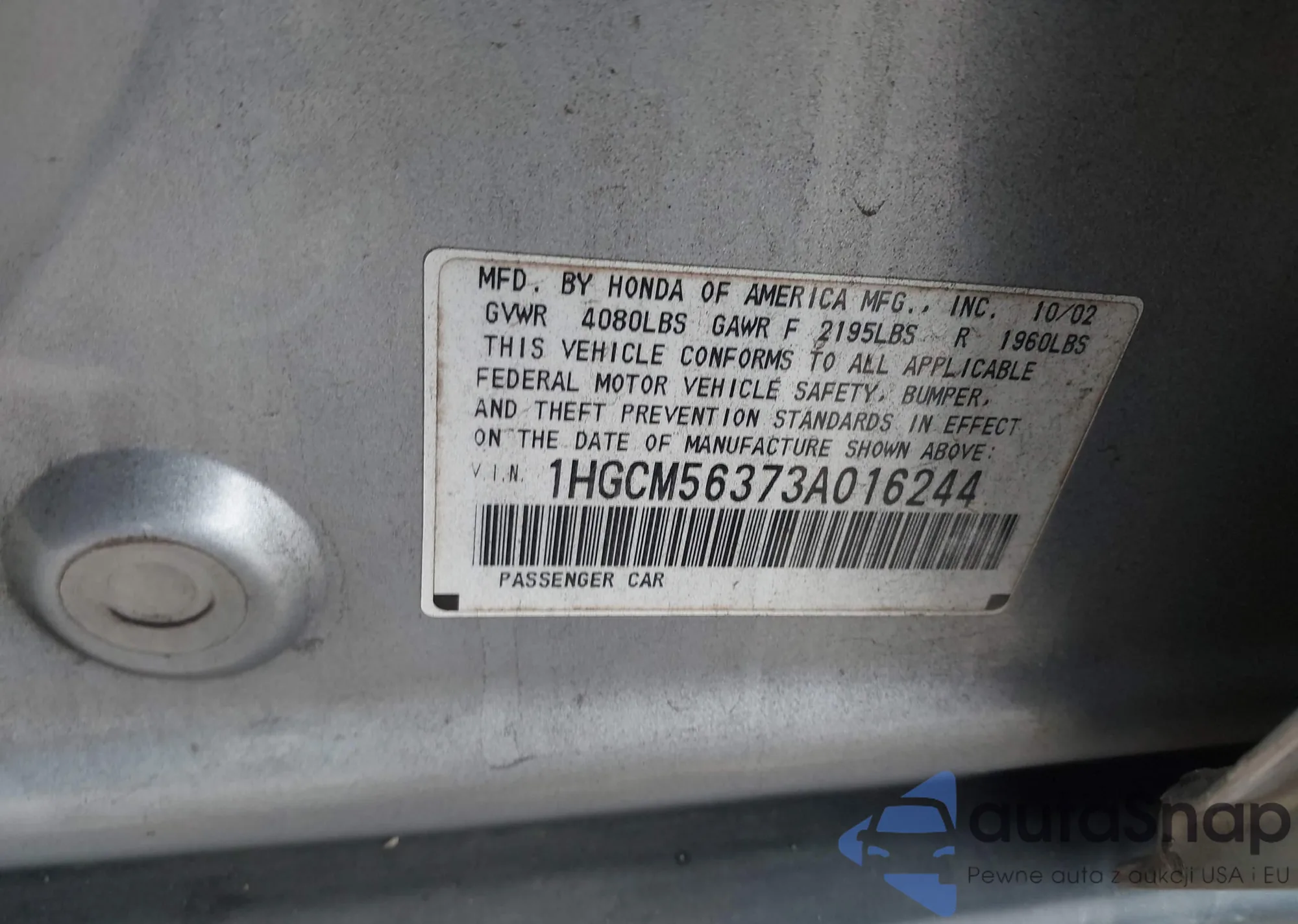 LOT: 42208187 VIN: 1HGCM56373A016244