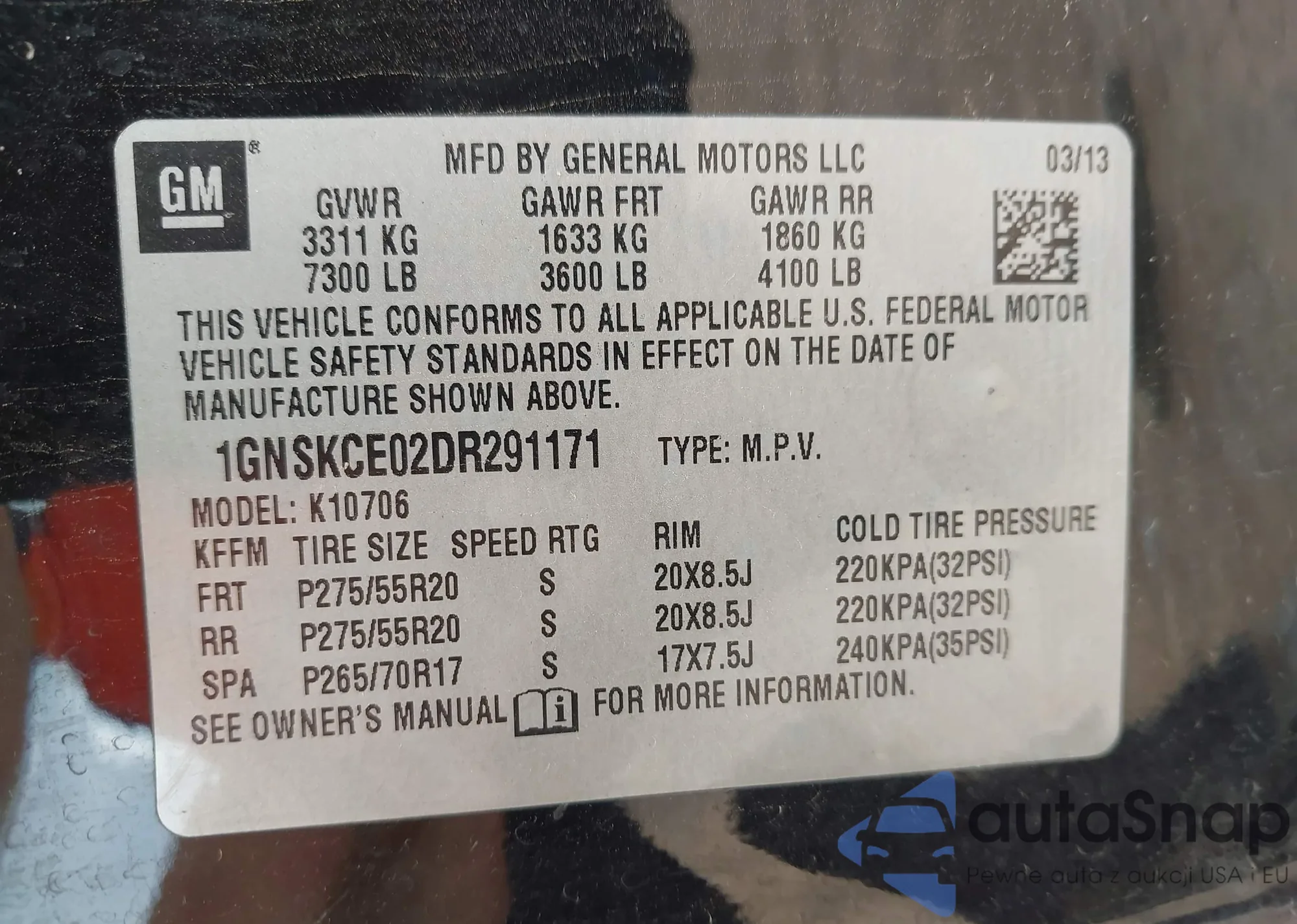 LOT: 42213401 VIN: 1GNSKCE02DR291171