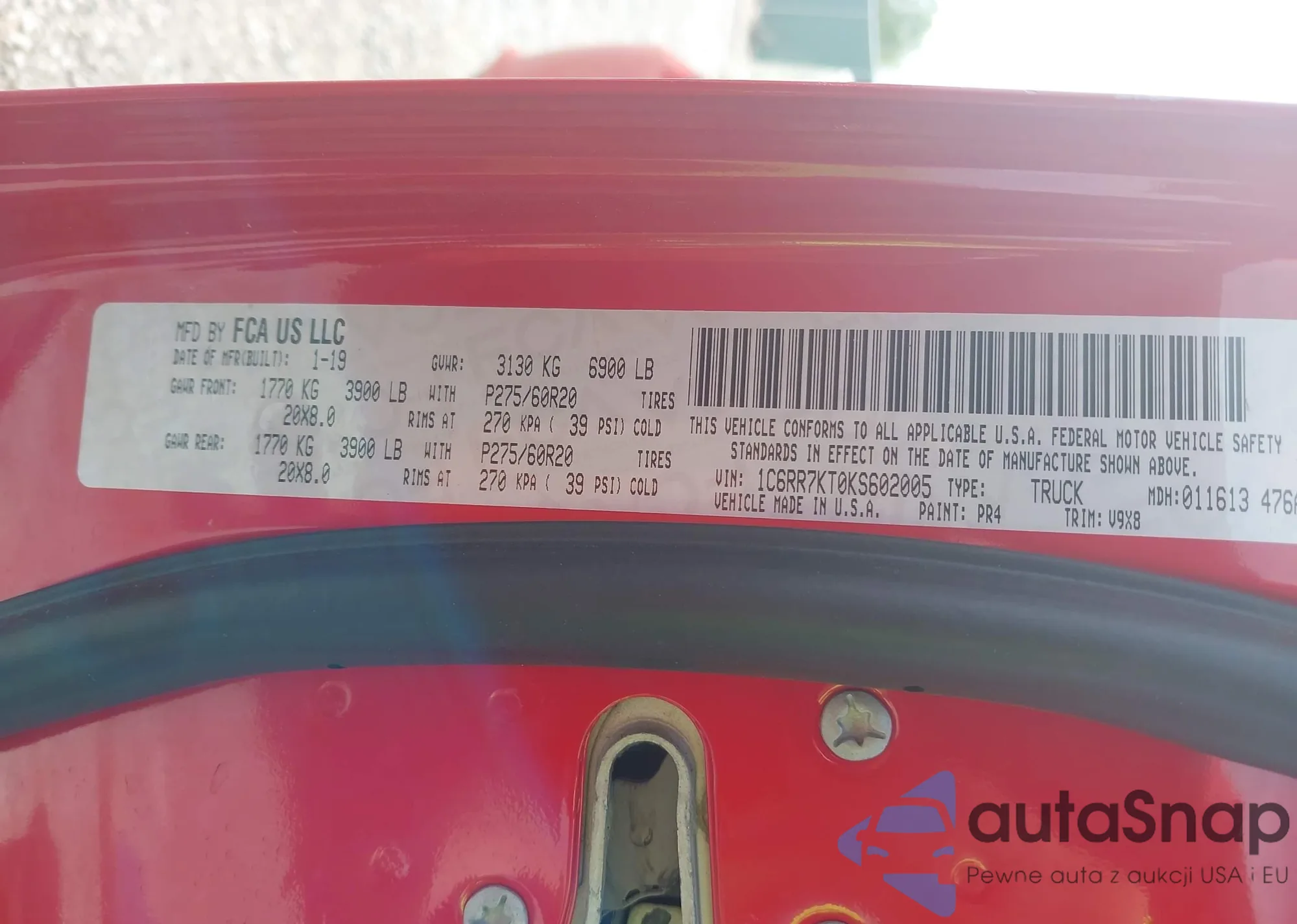 LOT: 42012106 VIN: 1C6RR7KT0KS602005