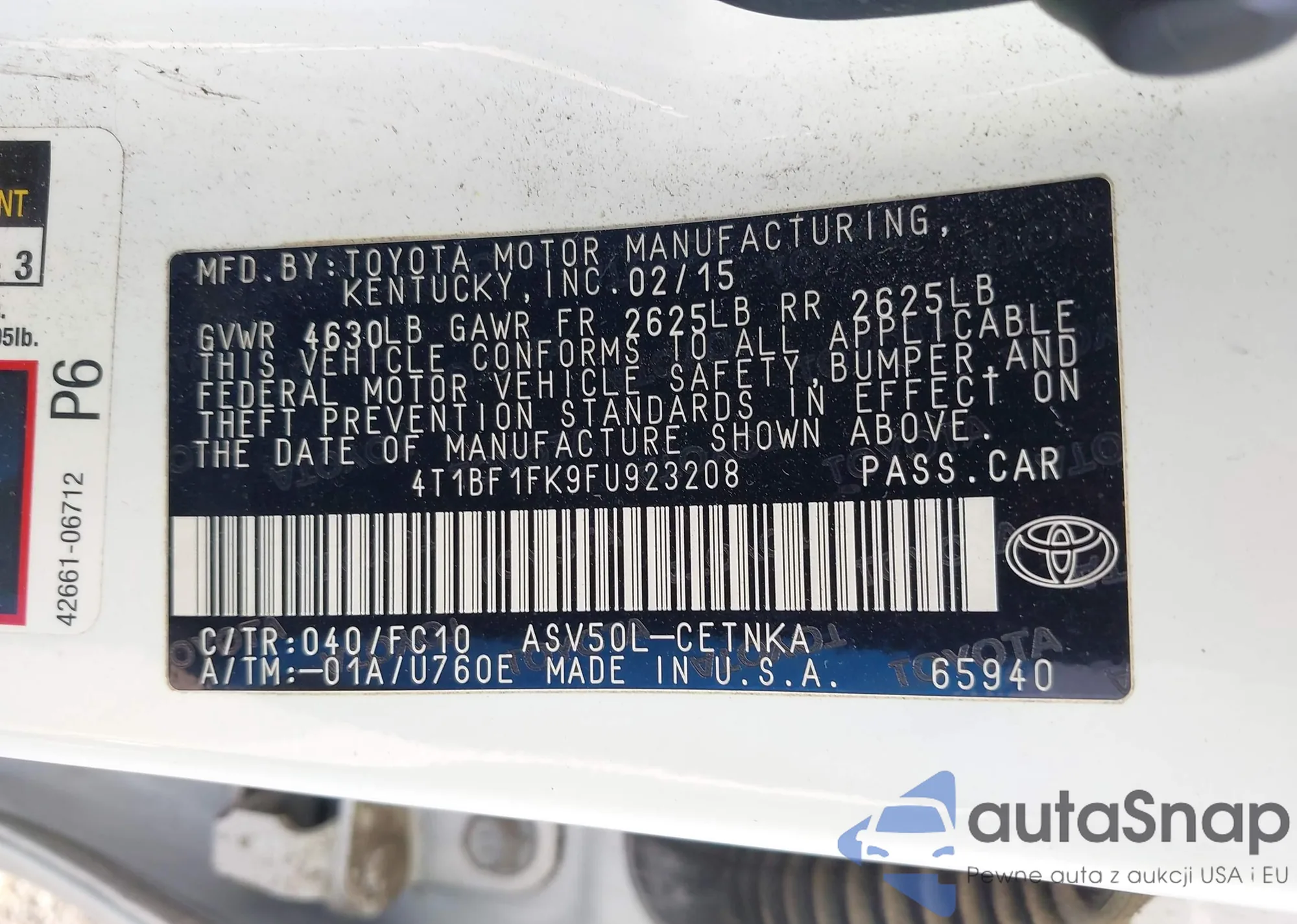 LOT: 42076970 VIN: 4T1BF1FK9FU923208