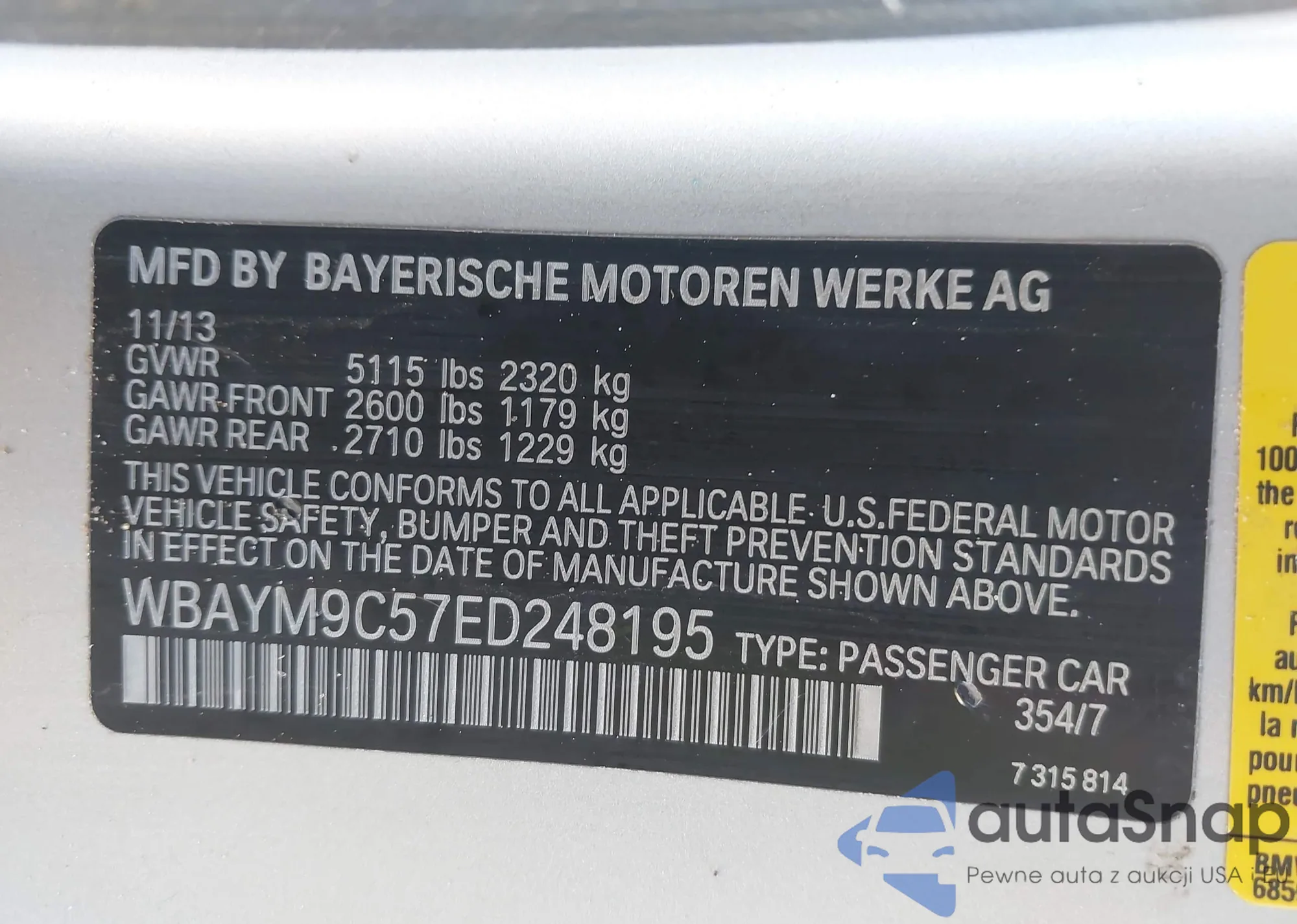LOT: 41231716 VIN: WBAYM9C57ED248195