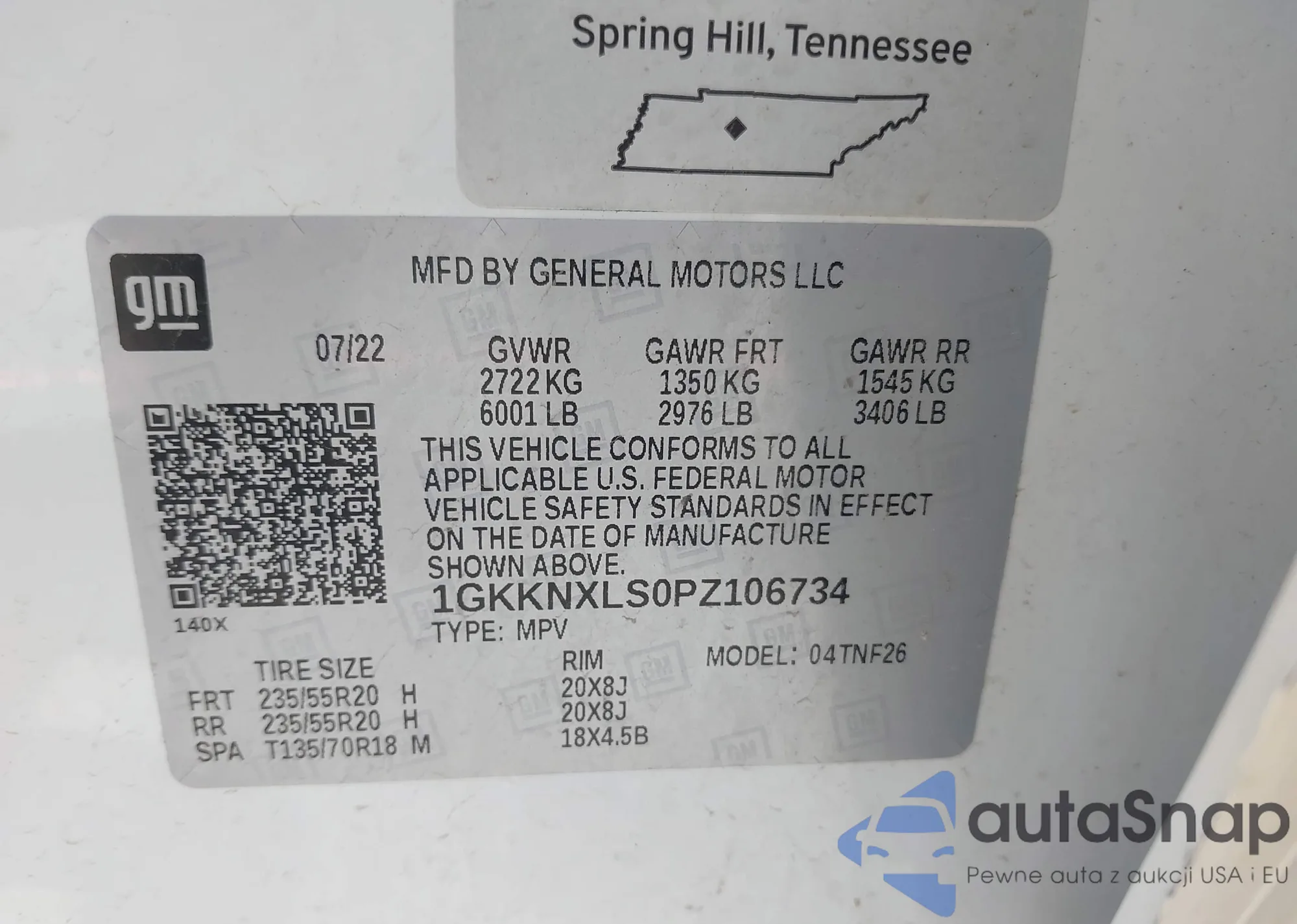 • VIN 1GKKNXLS0PZ106734