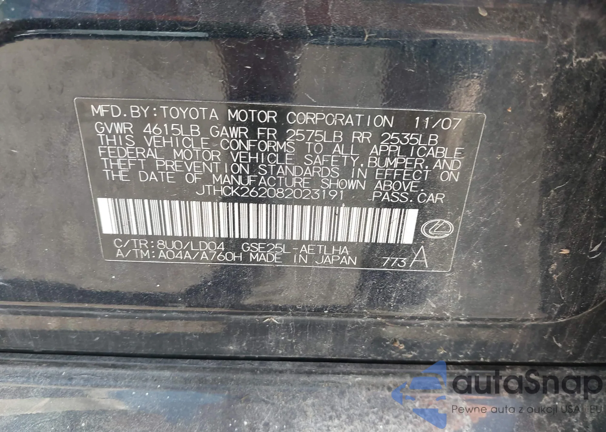 LOT: 42142085 VIN: JTHCK262082023191