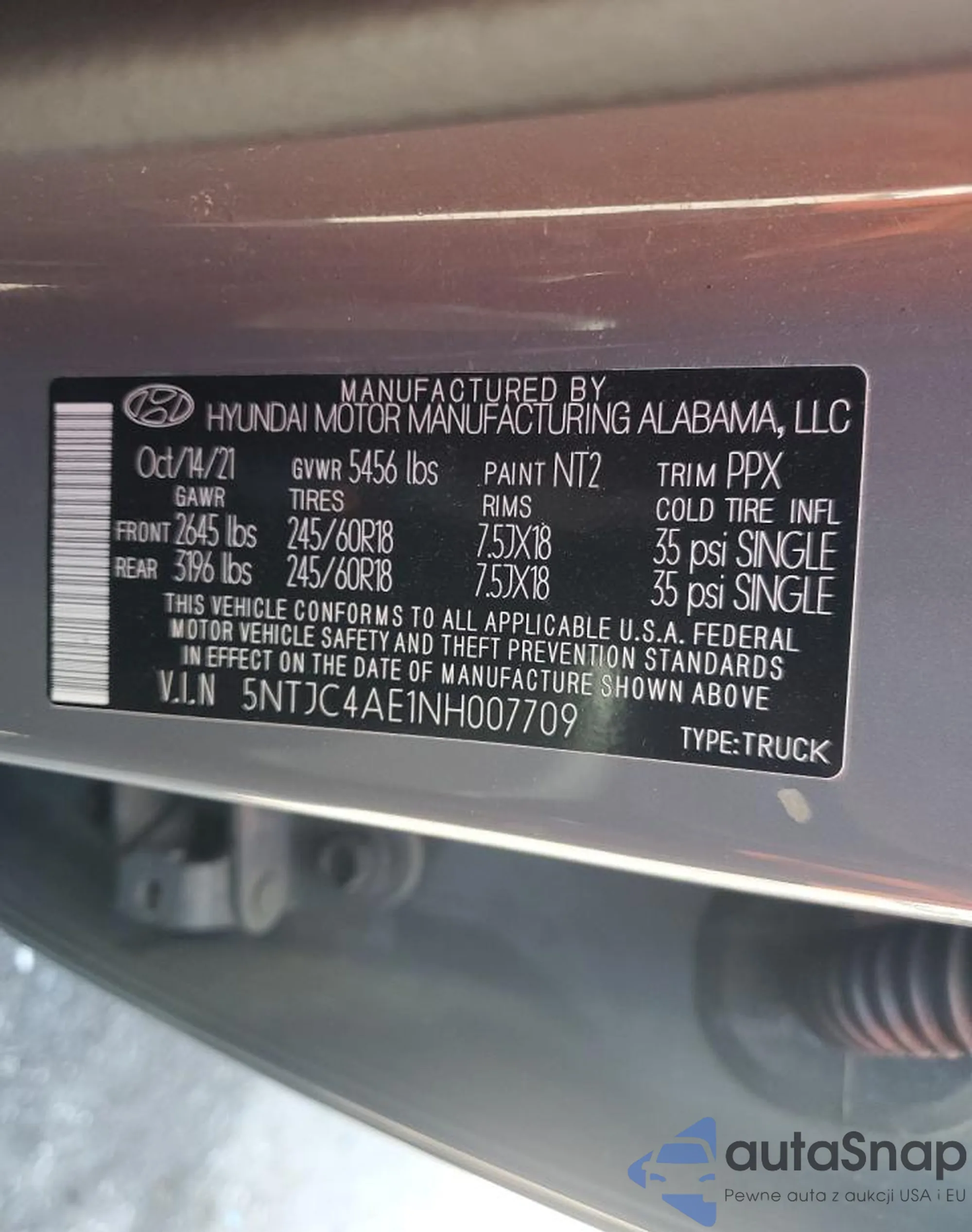 • VIN 5NTJC4AE1NH007709