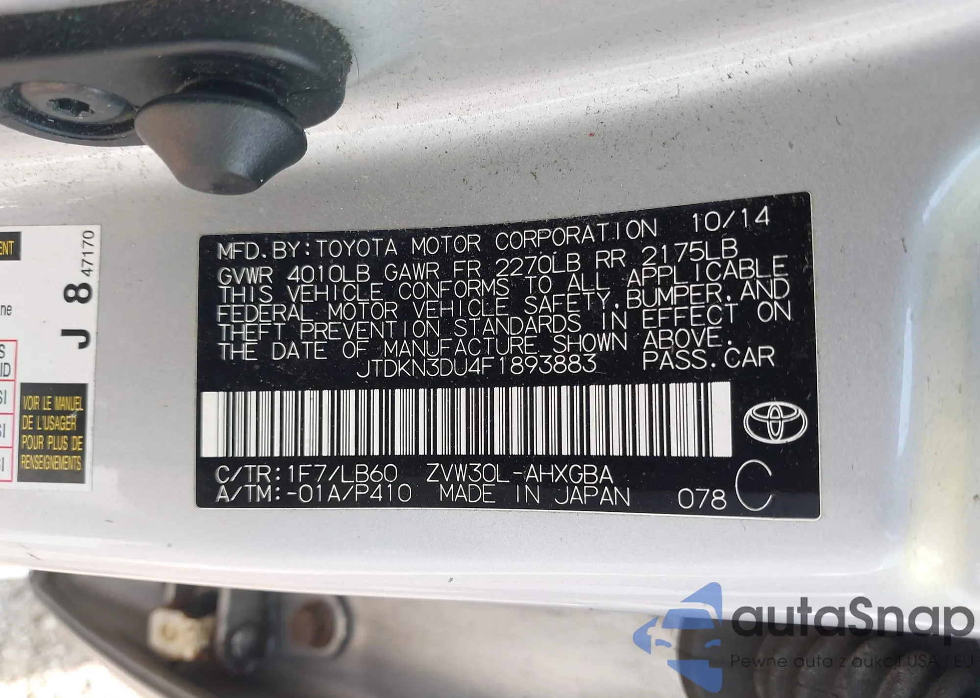 LOT: 40167400 VIN: JTDKN3DU4F1893883