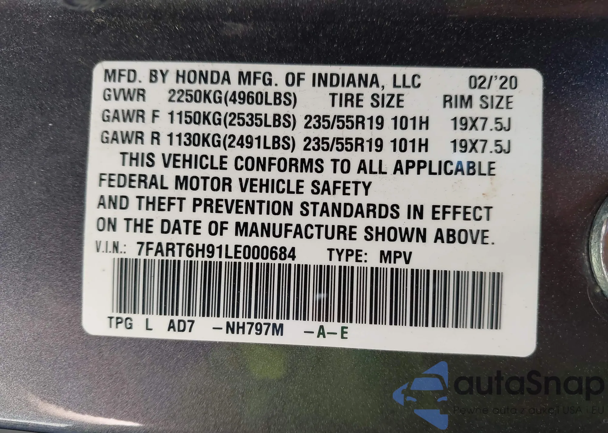 LOT: 42256932 VIN: 7FART6H91LE000684