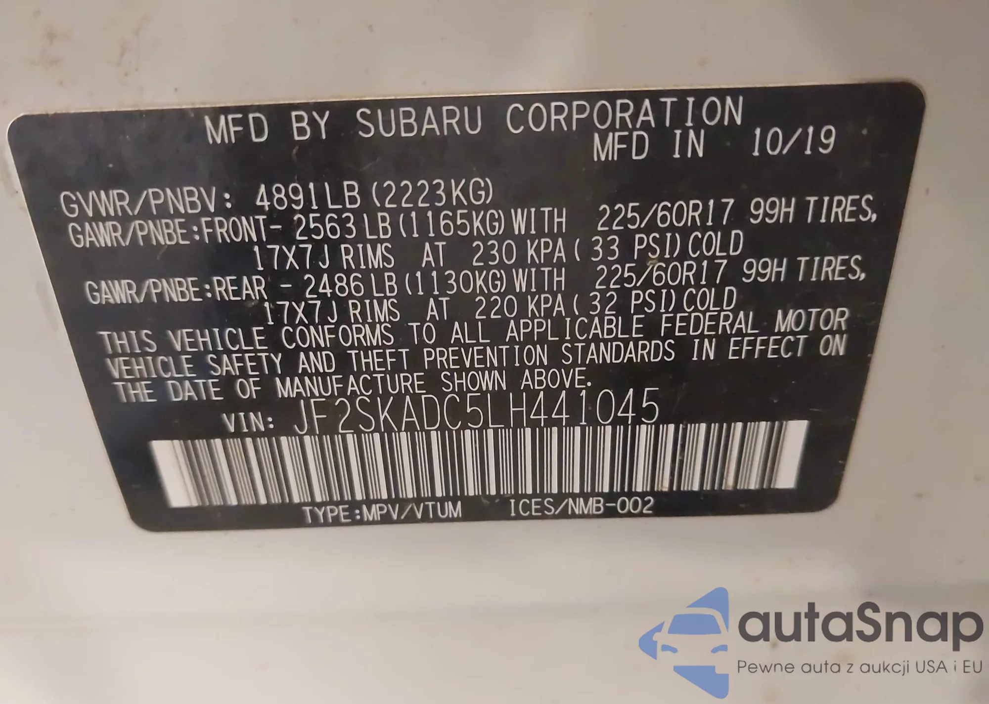 LOT: 42263593 VIN: JF2SKADC5LH441045