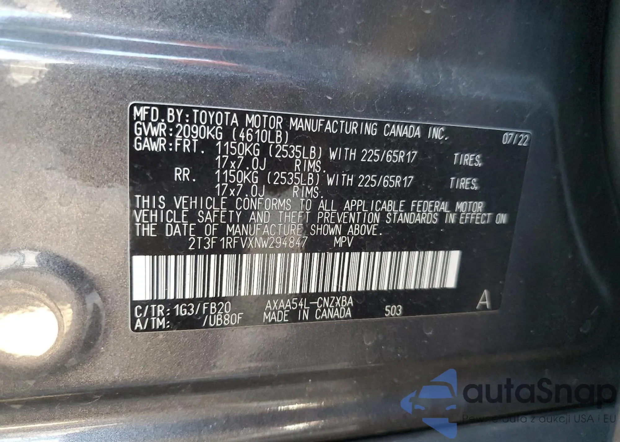 • VIN 2T3F1RFVXNW294847