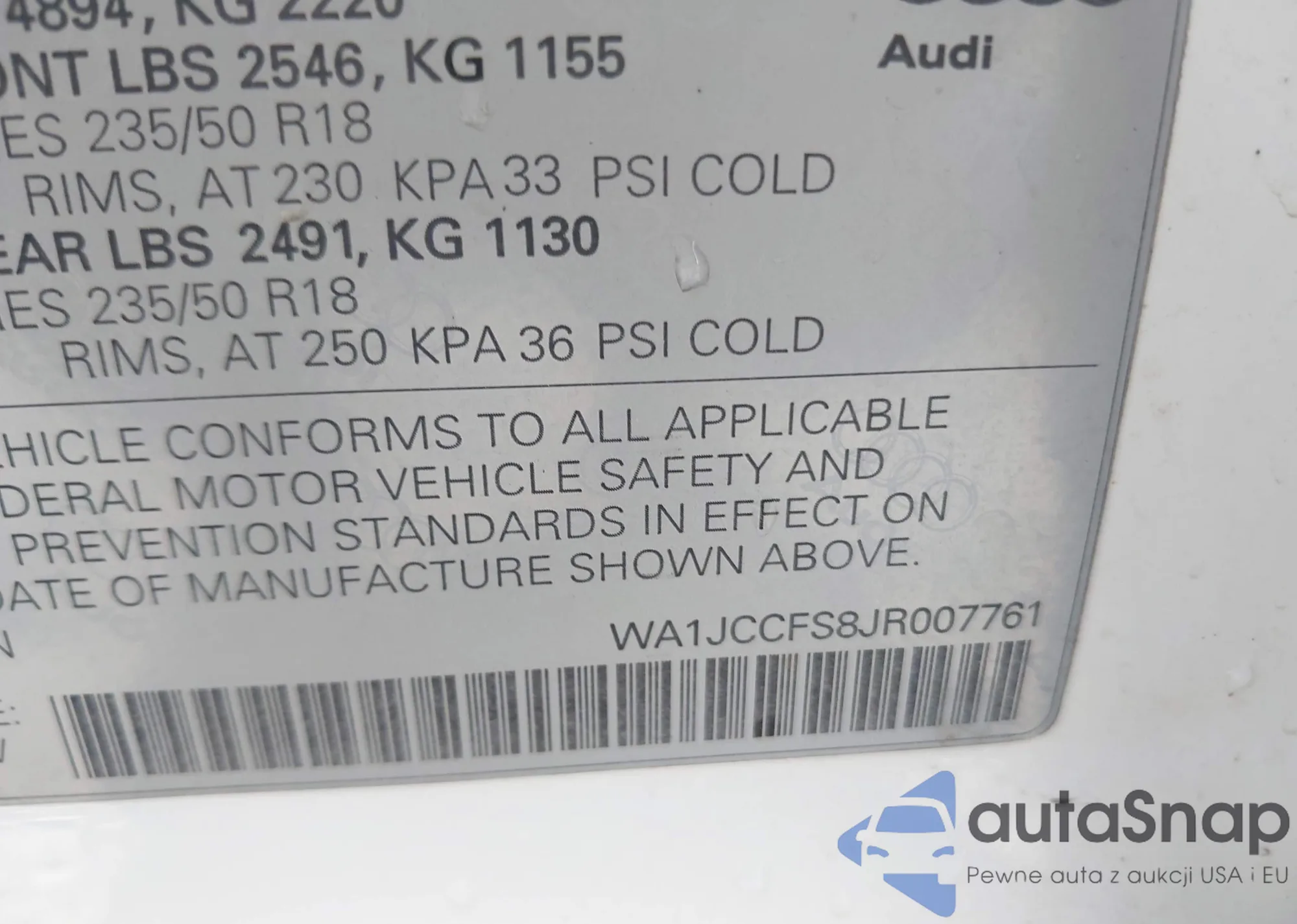 LOT: 42064812 VIN: WA1JCCFS8JR007761