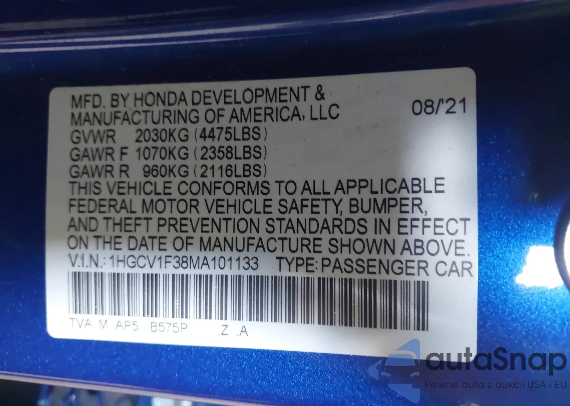 • VIN 1HGCV1F38MA101133