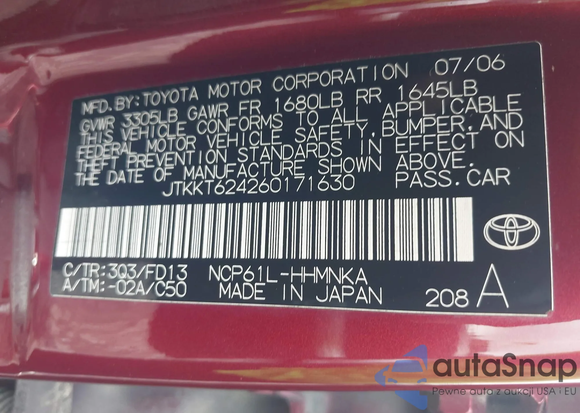 LOT: 42161145 VIN: JTKKT624260171630