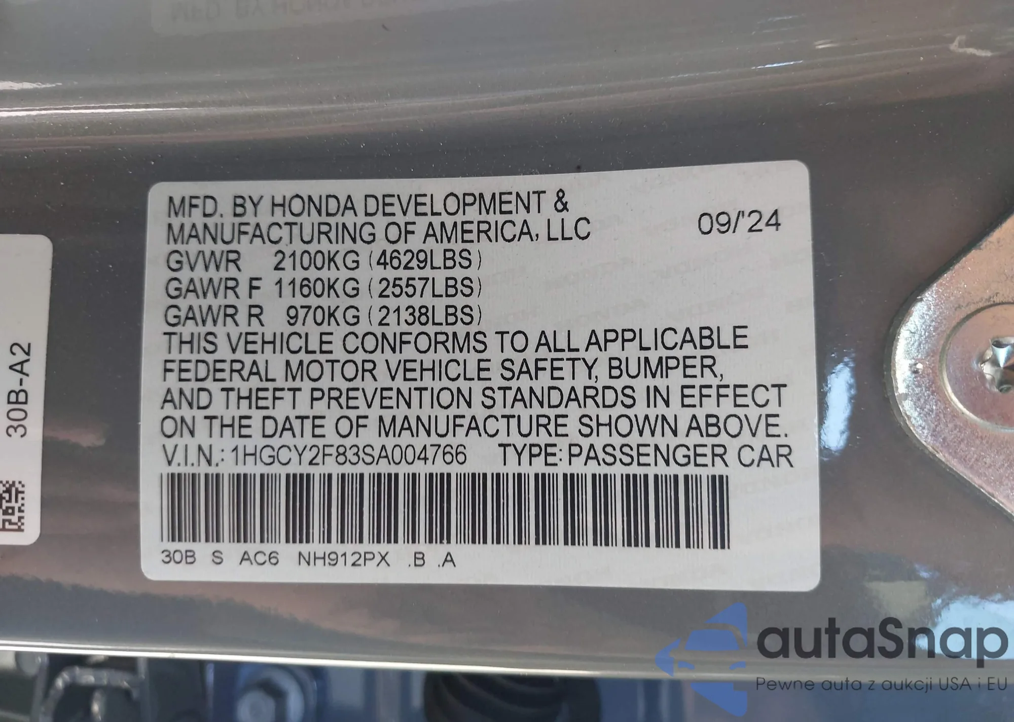 • VIN 1HGCY2F83SA004766