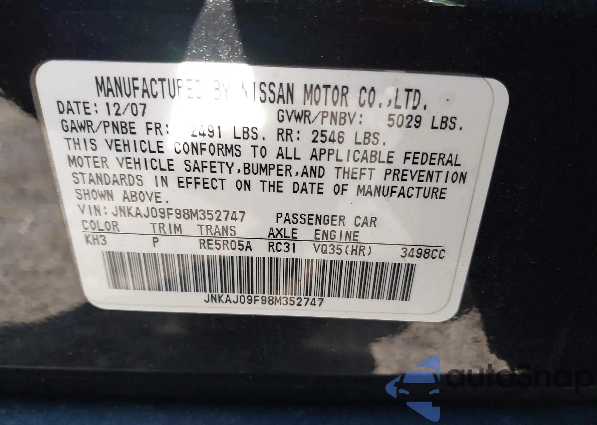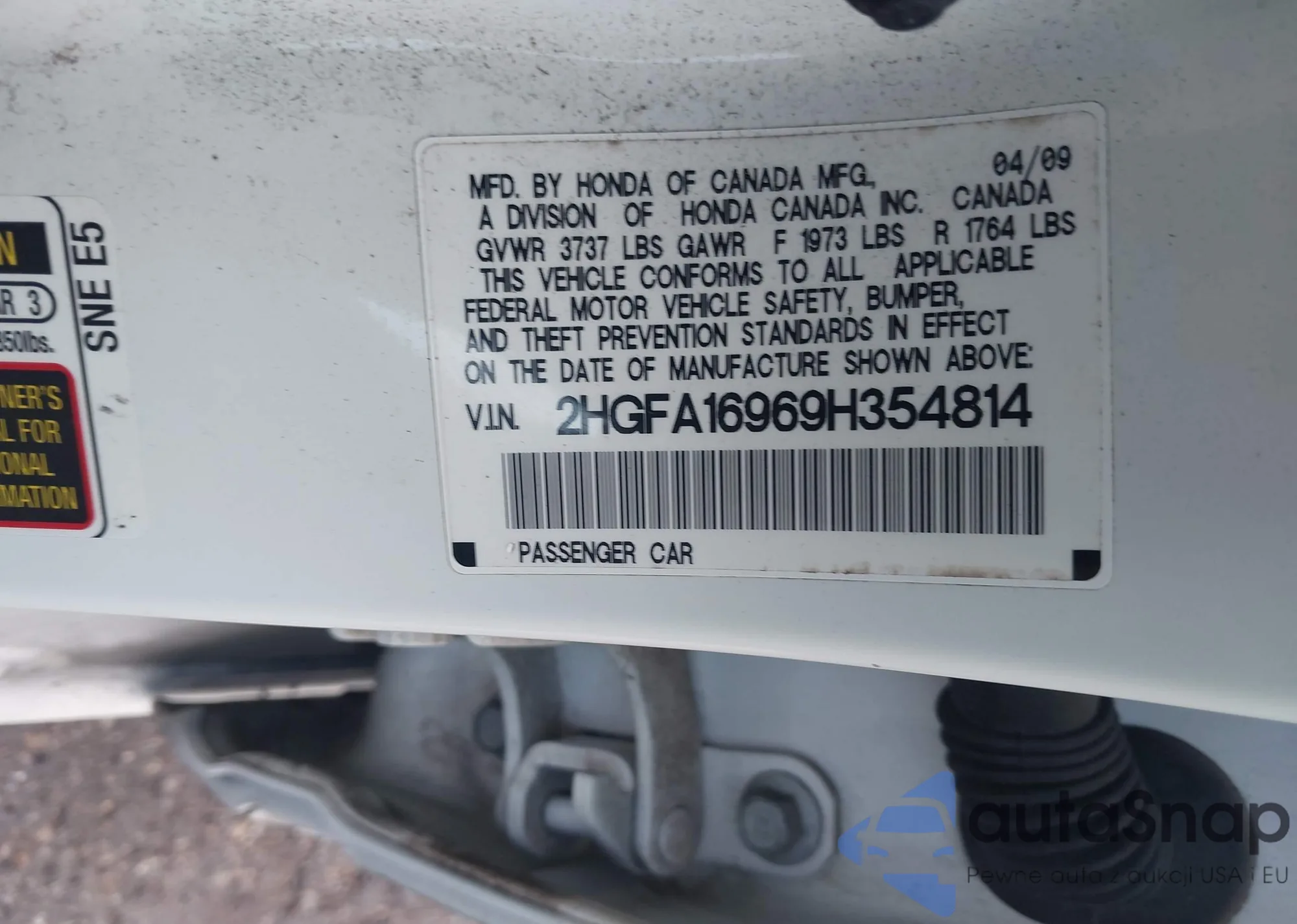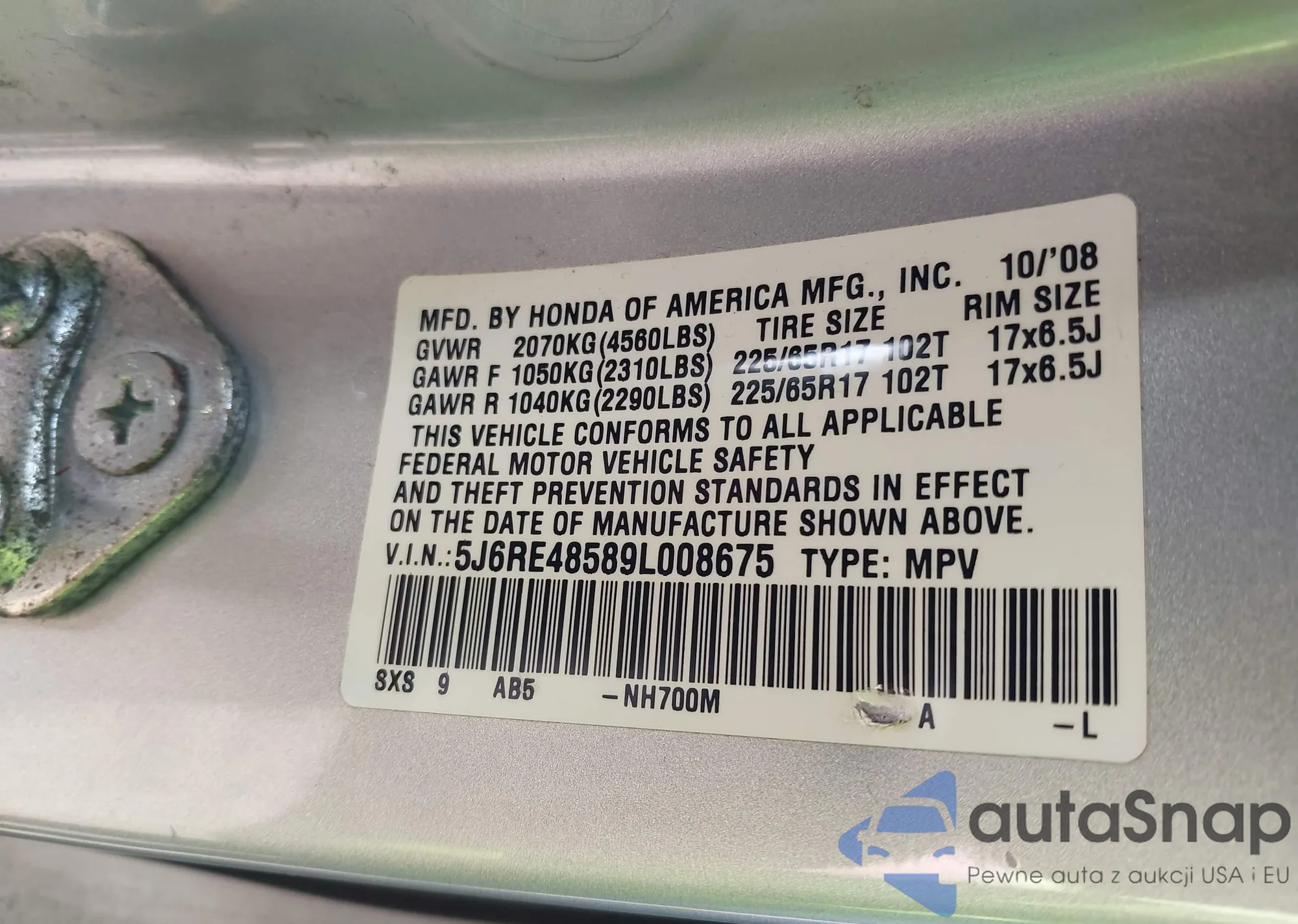 • VIN 5J6RE48589L008675