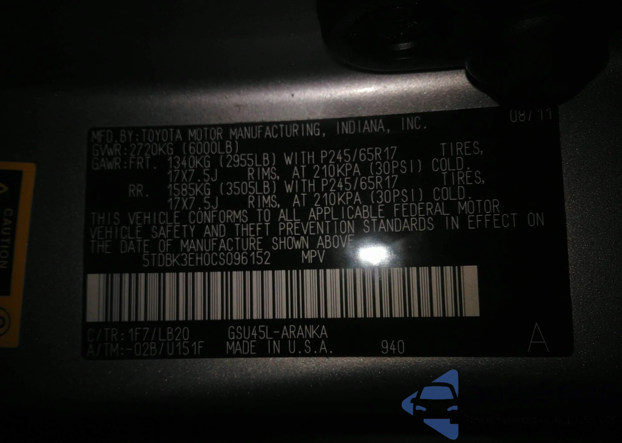 • VIN 5TDBK3EH0CS096152
