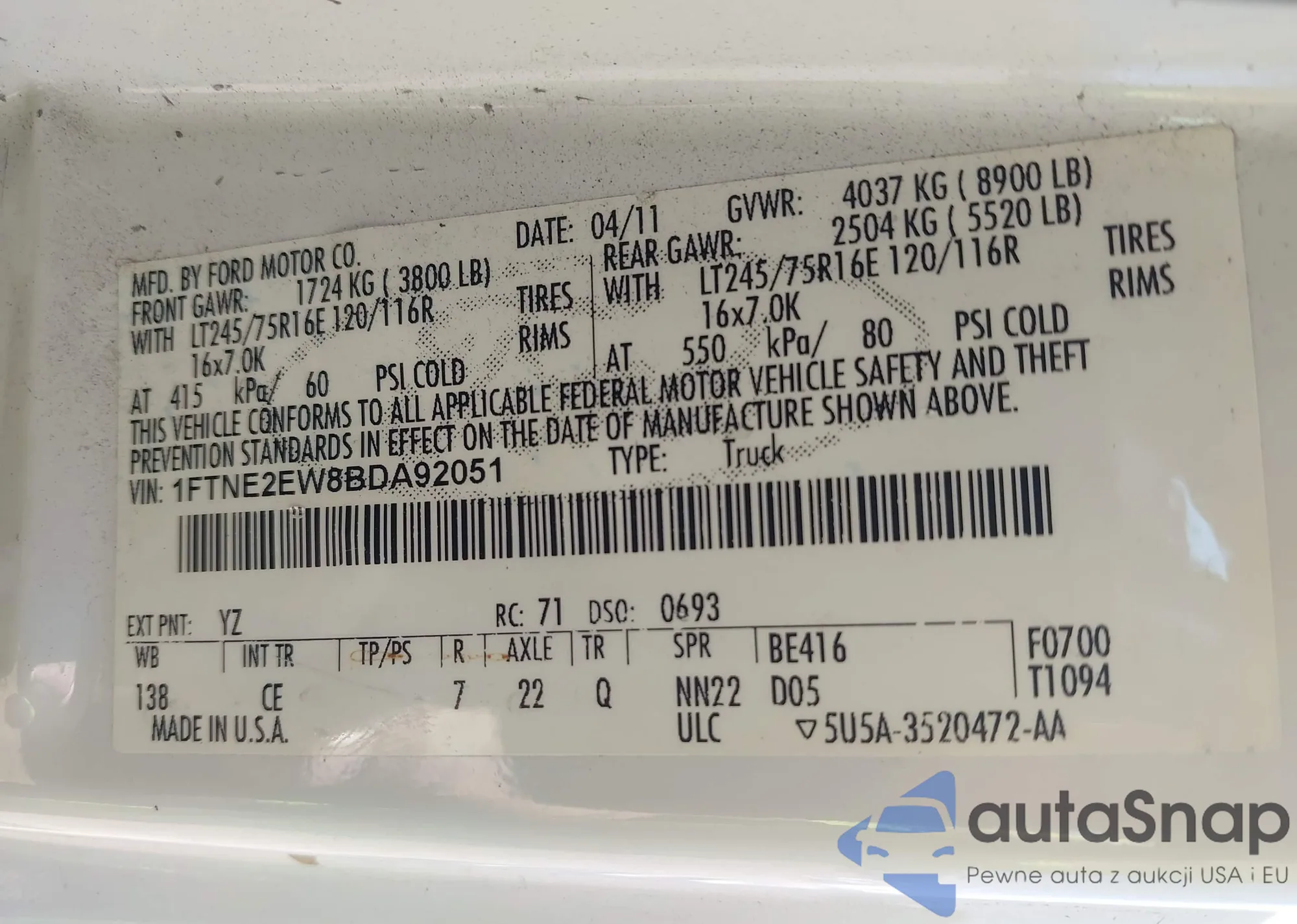 LOT: 42101701 VIN: 1FTNE2EW8BDA92051