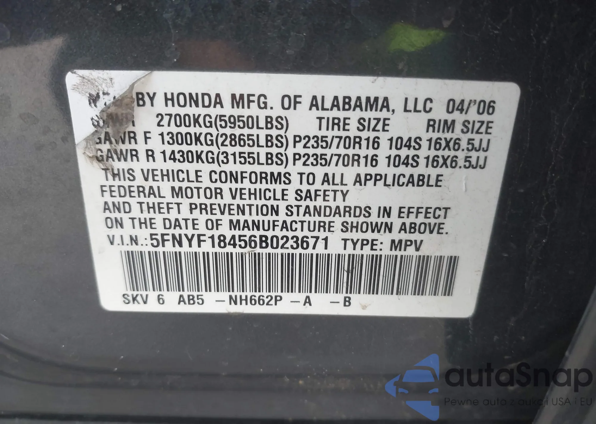 LOT: 41950101 VIN: 2HKYF18587H515168