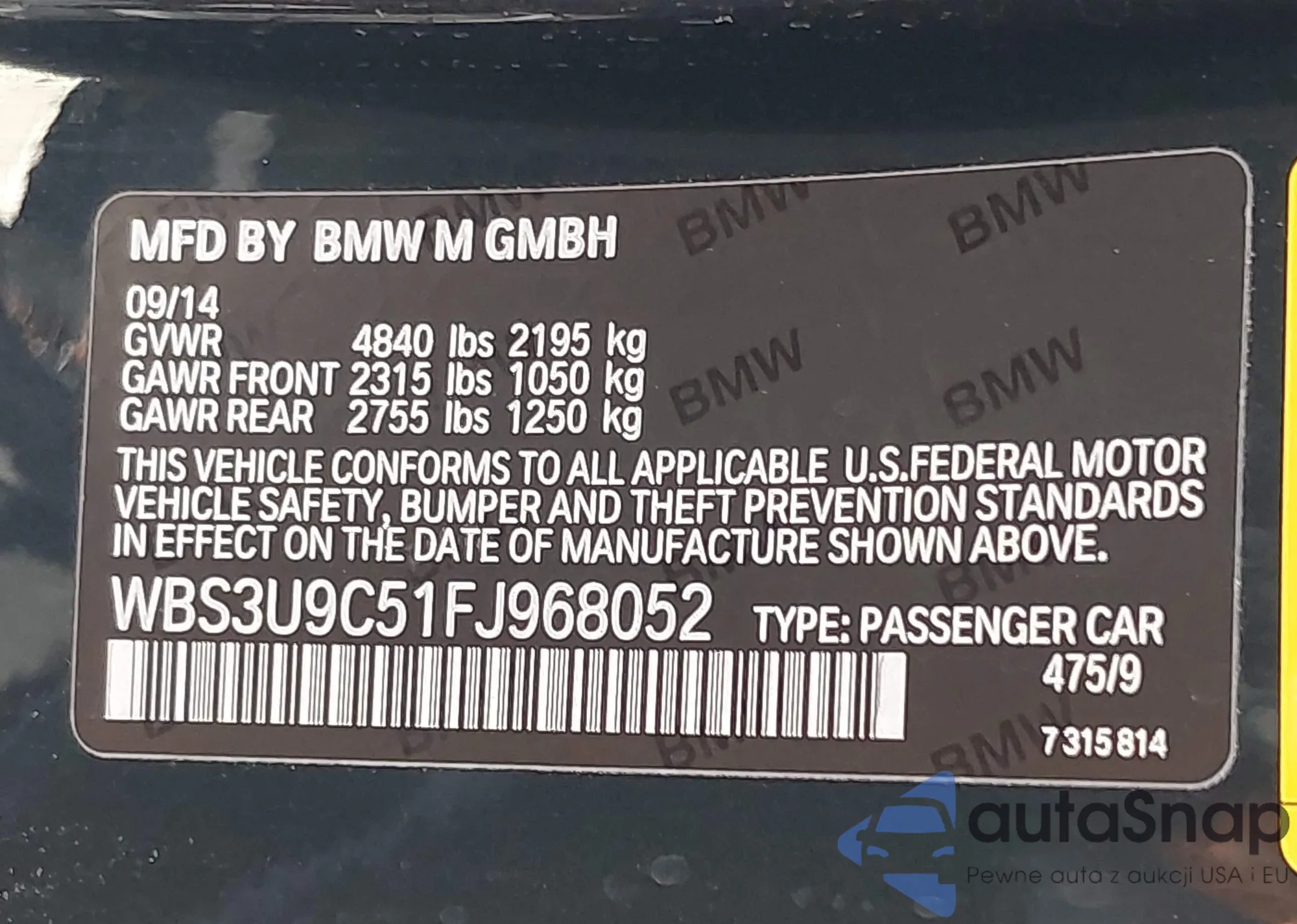 LOT: 42301612 VIN: WBS3U9C51FJ968052