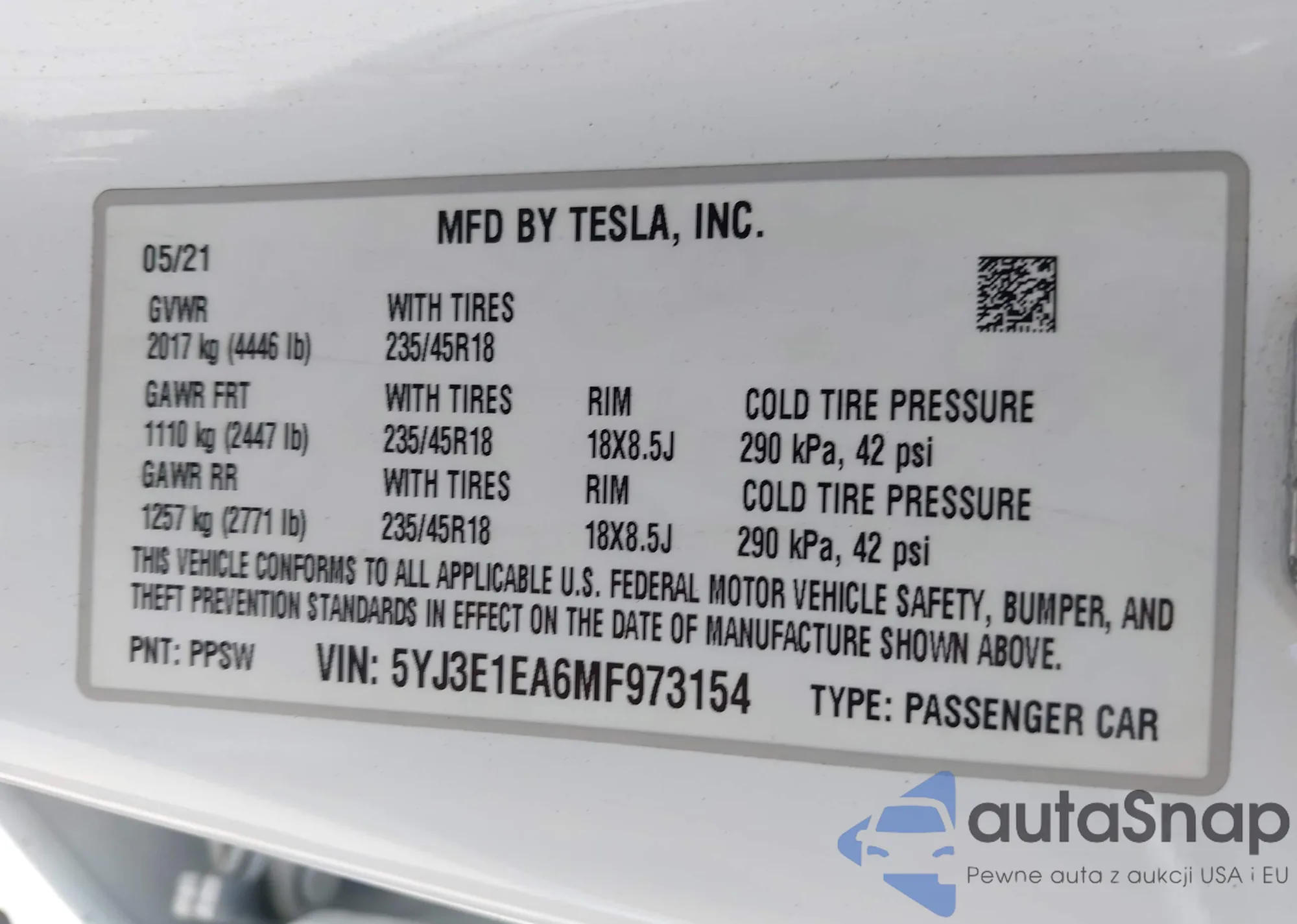 • VIN 5YJ3E1EA6MF973154
