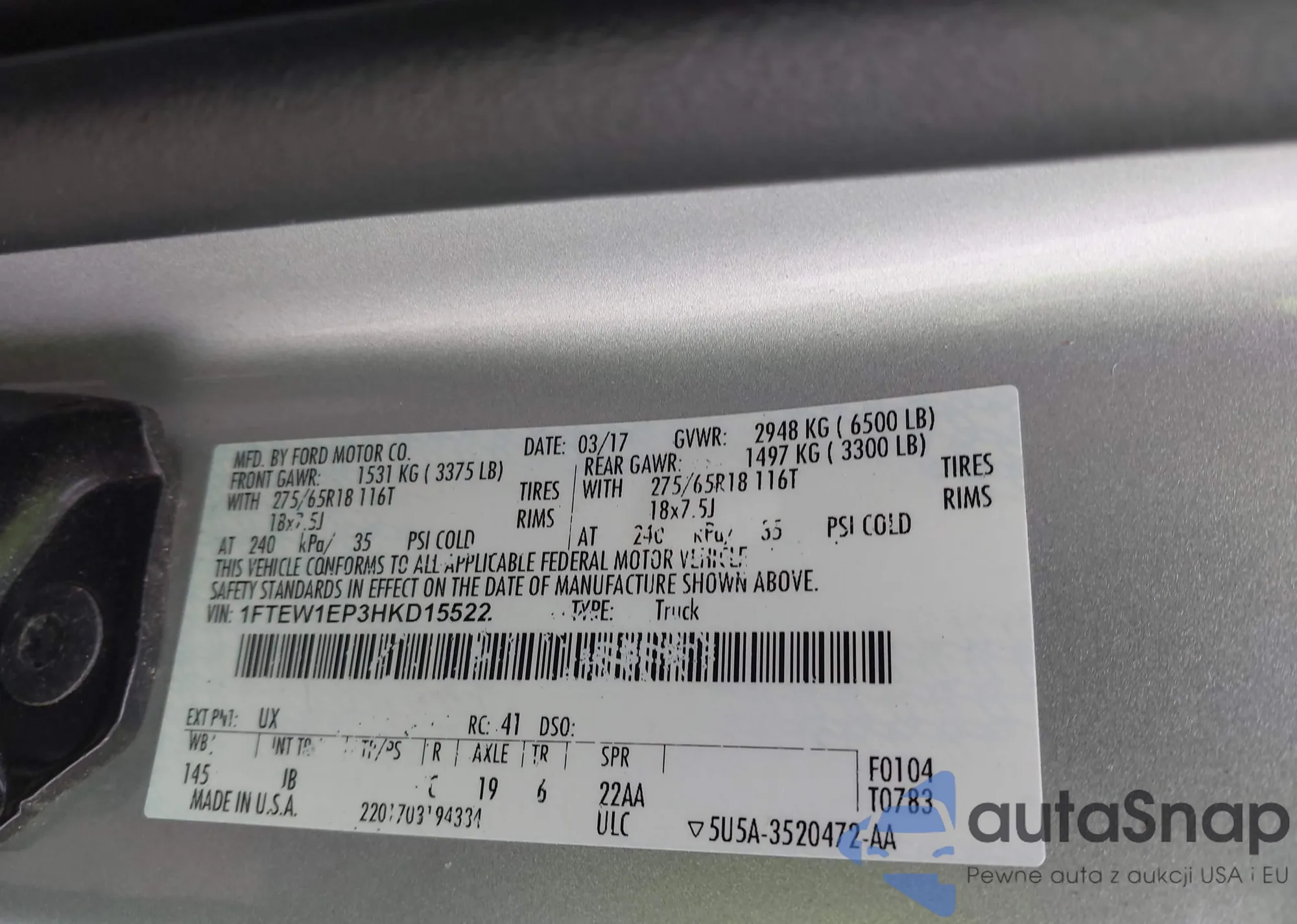 • VIN 1FTEW1EP3HKD15522