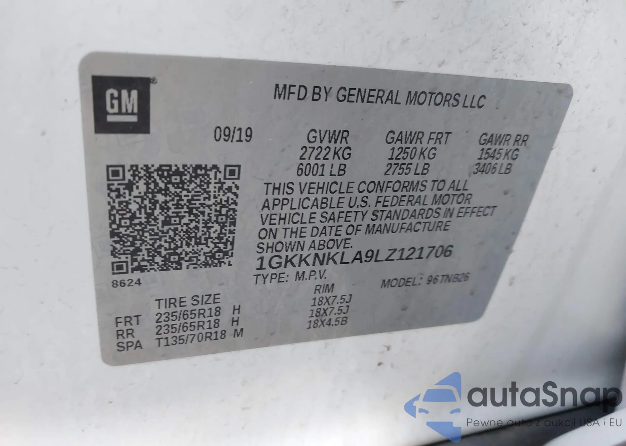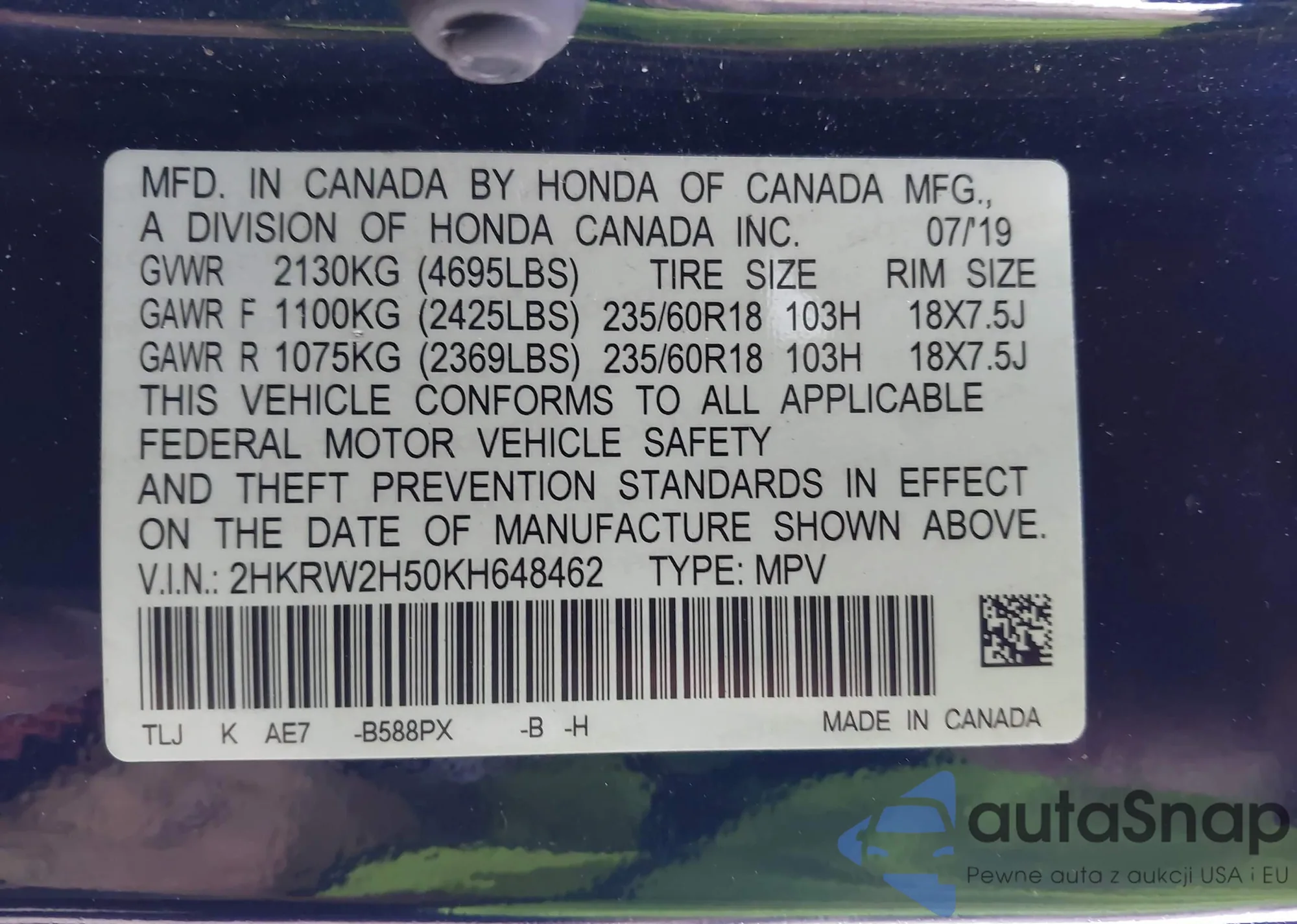 • VIN 2HKRW2H50KH648462
