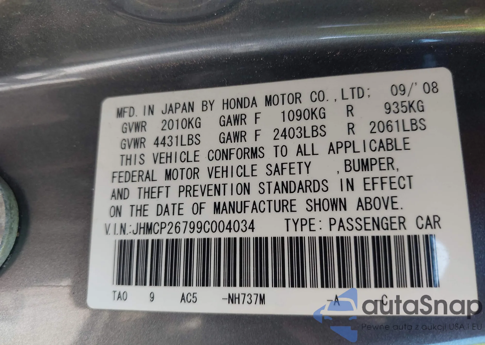 LOT: 42119755 VIN: JHMCP26799C004034