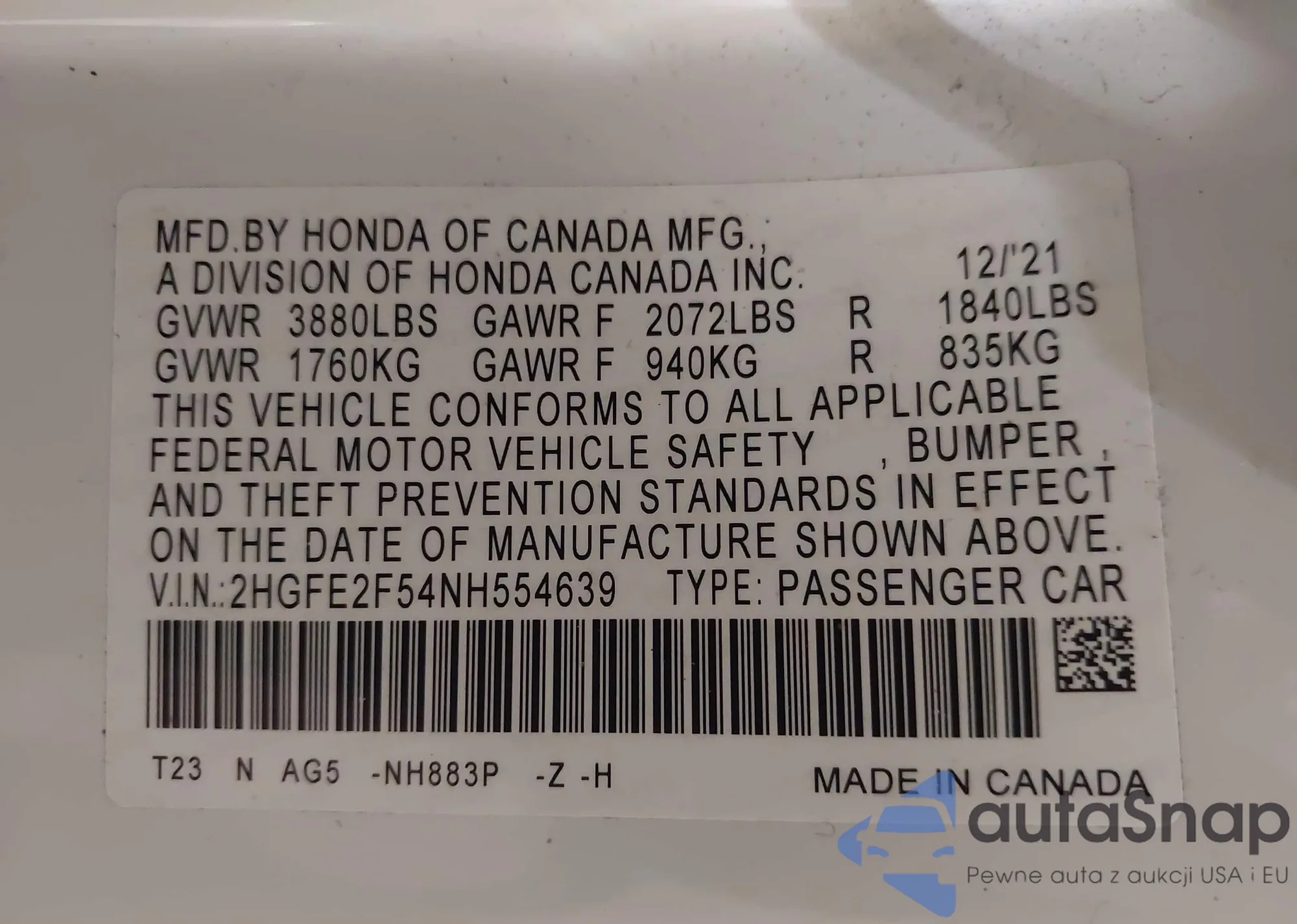 • VIN 2HGFE2F54PH529078