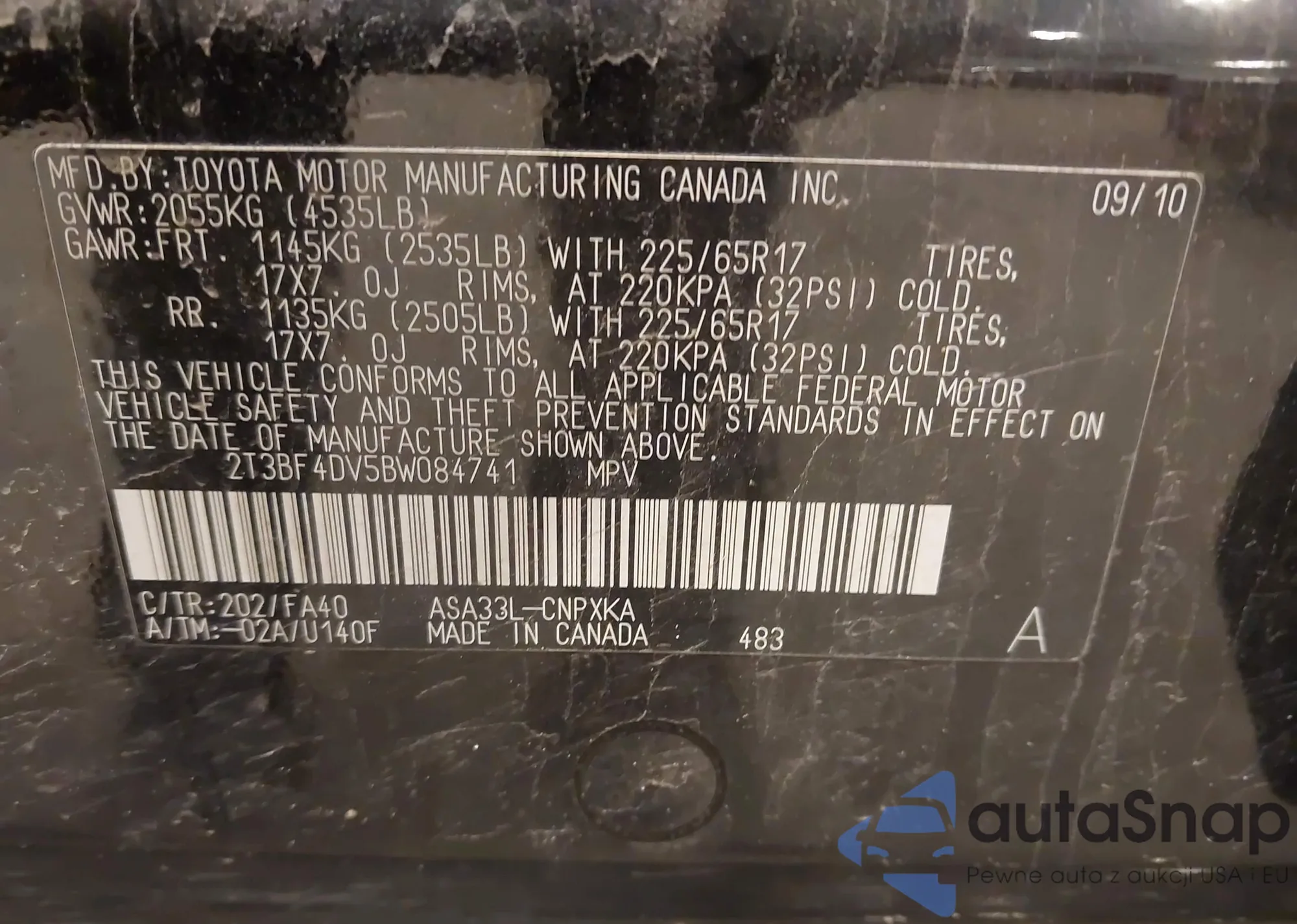 • VIN 2T3BF4DV5BW084741