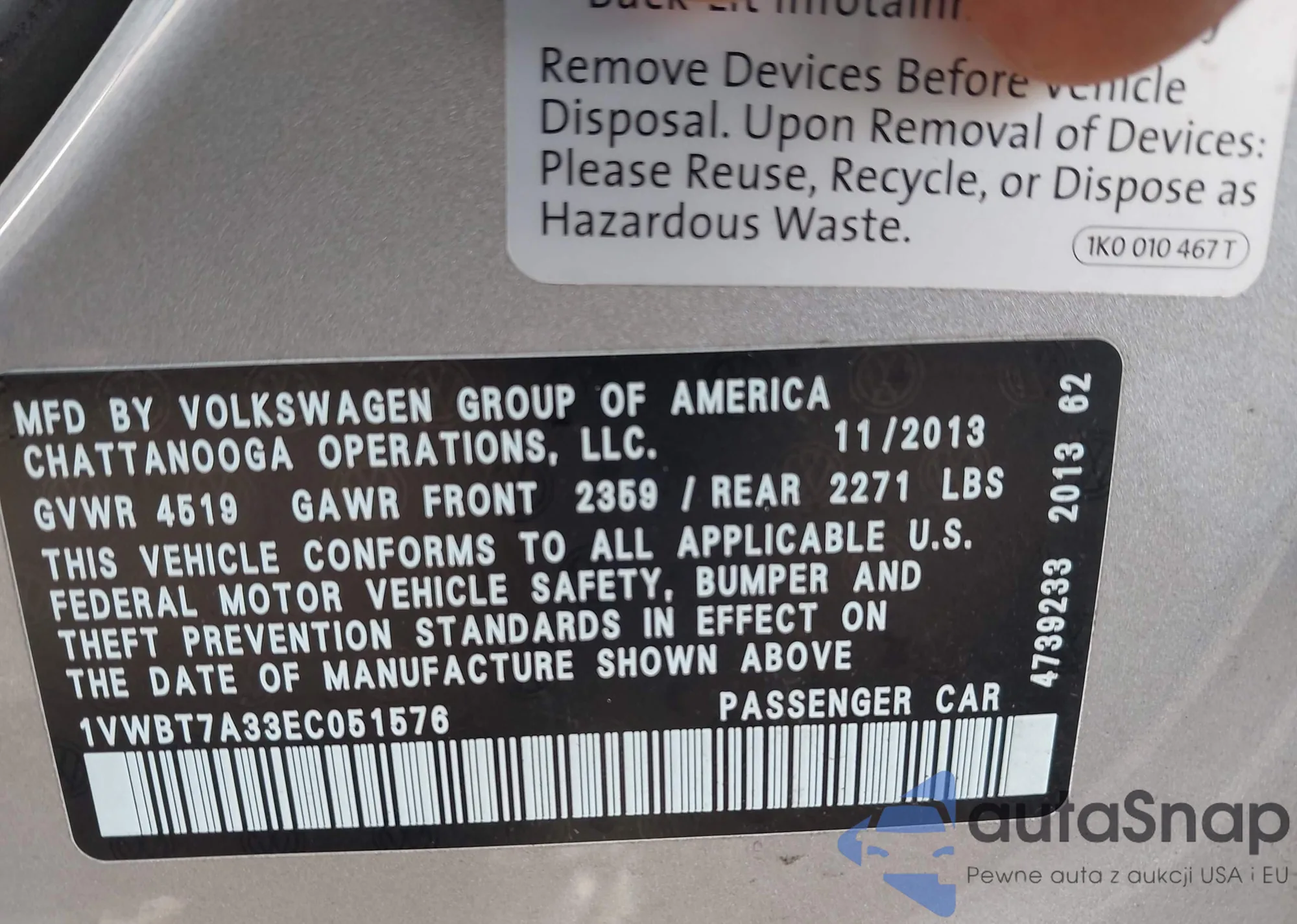 LOT: 42155893 VIN: 1VWBT7A33EC051576