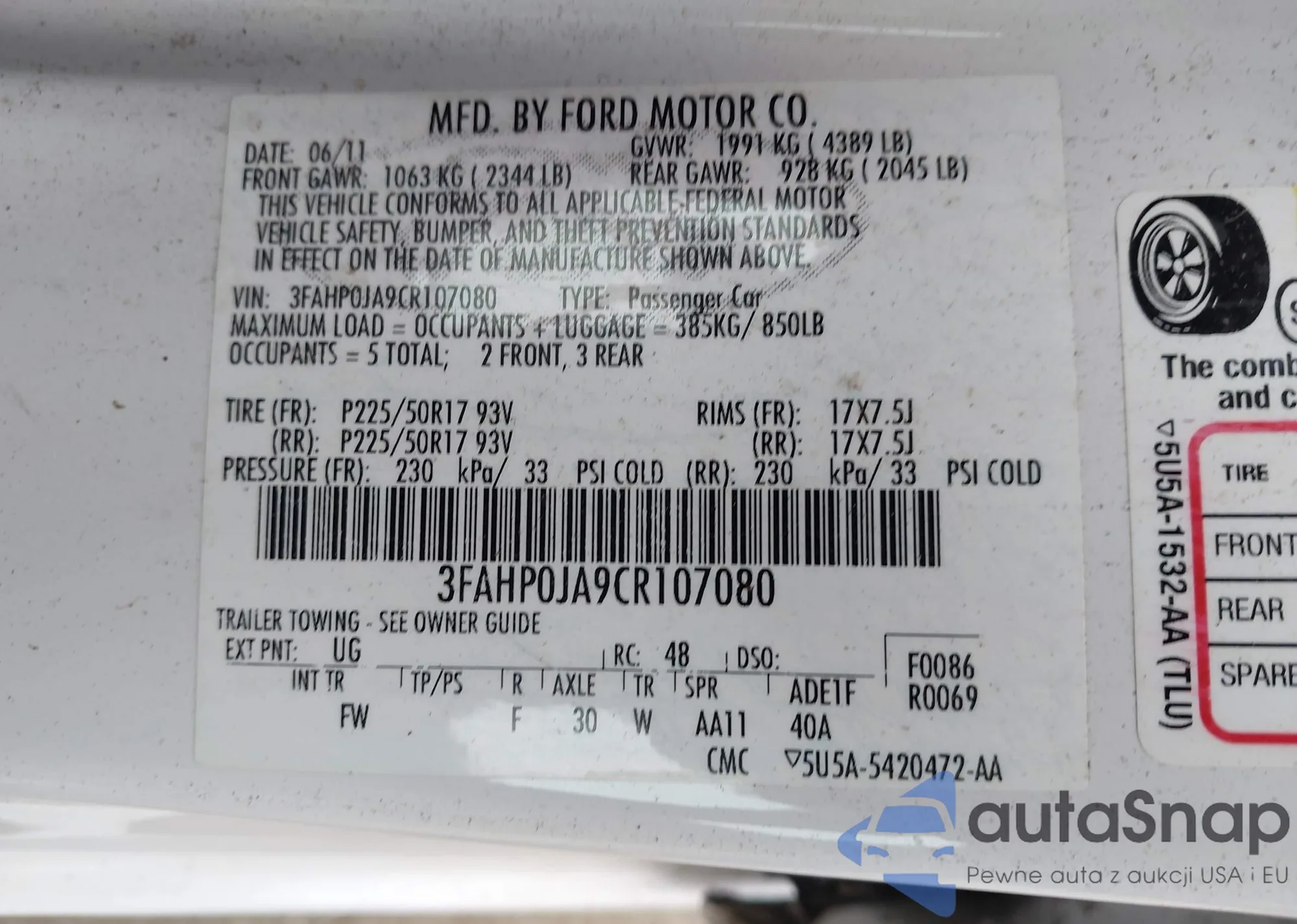 • VIN 3FAHP0JA9CR107080
