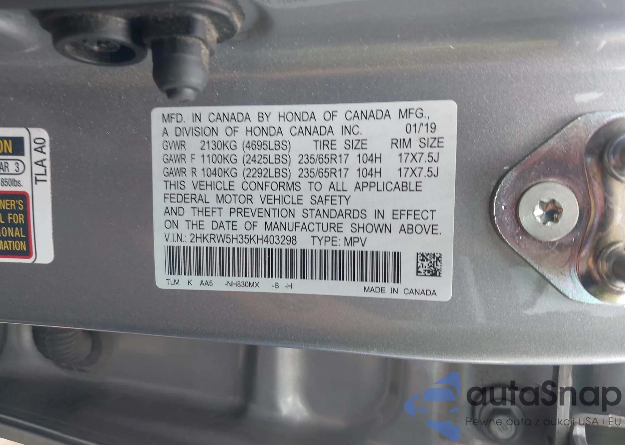 • VIN 2HKRW5H35KH403298