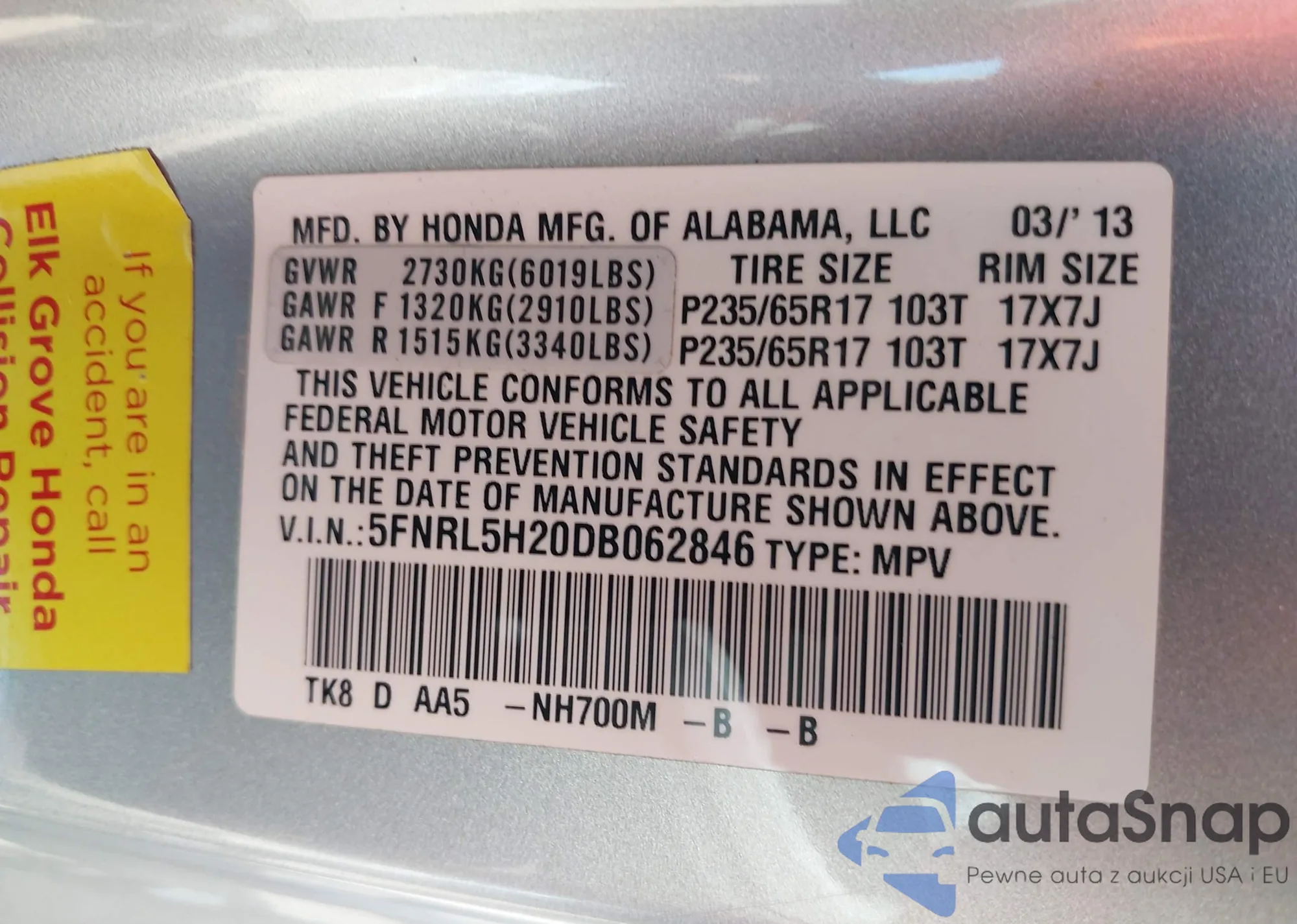 • VIN 5FNRL5H20DB062846