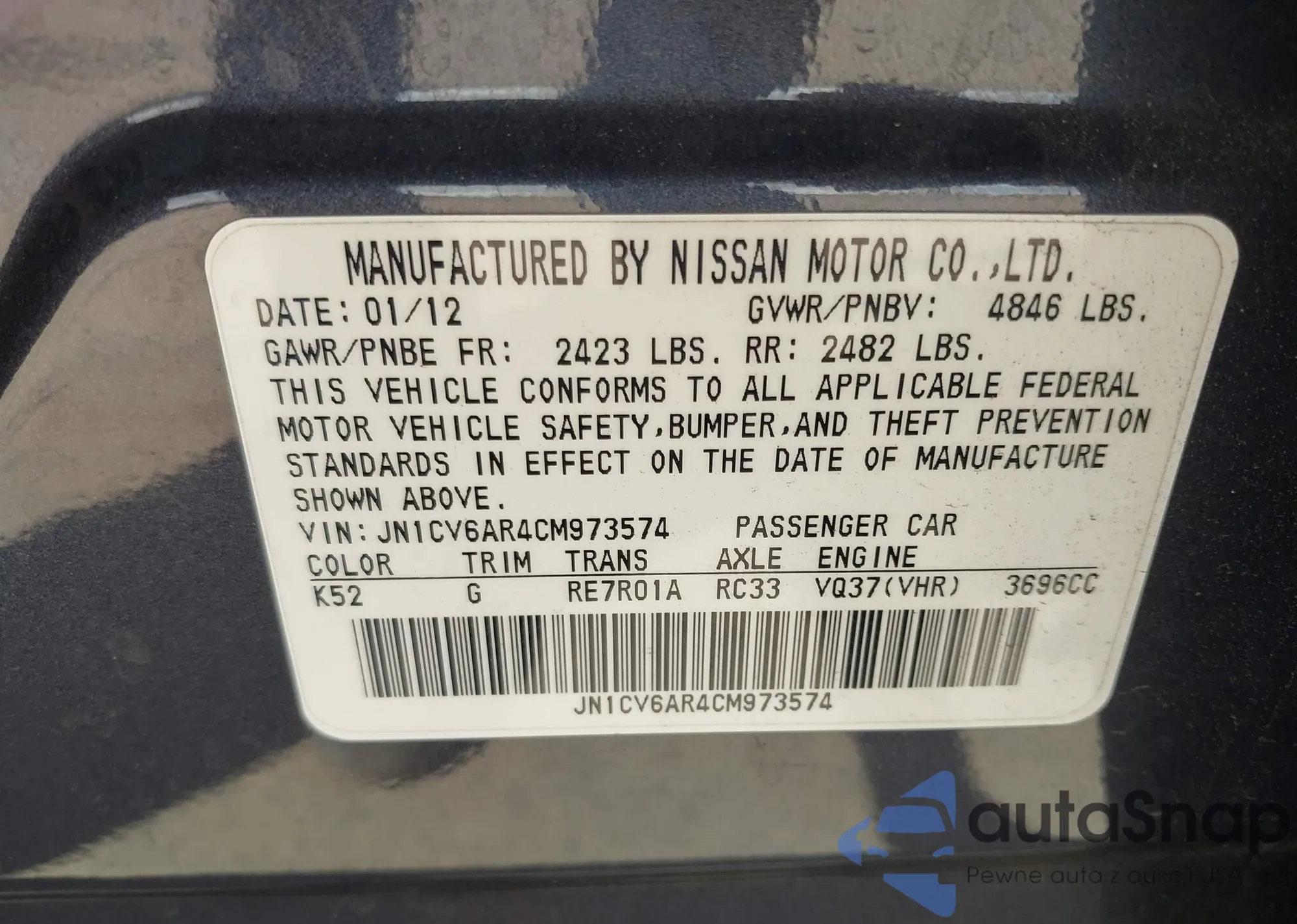LOT: 41910324 VIN: JN1CV6AR4CM973574