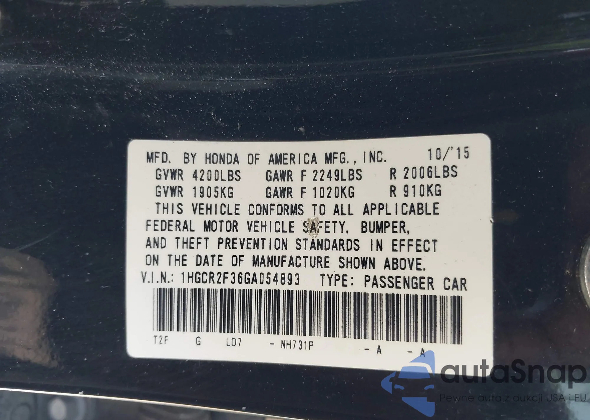 LOT: 42067490 VIN: 1HGCR2F3XDA099511