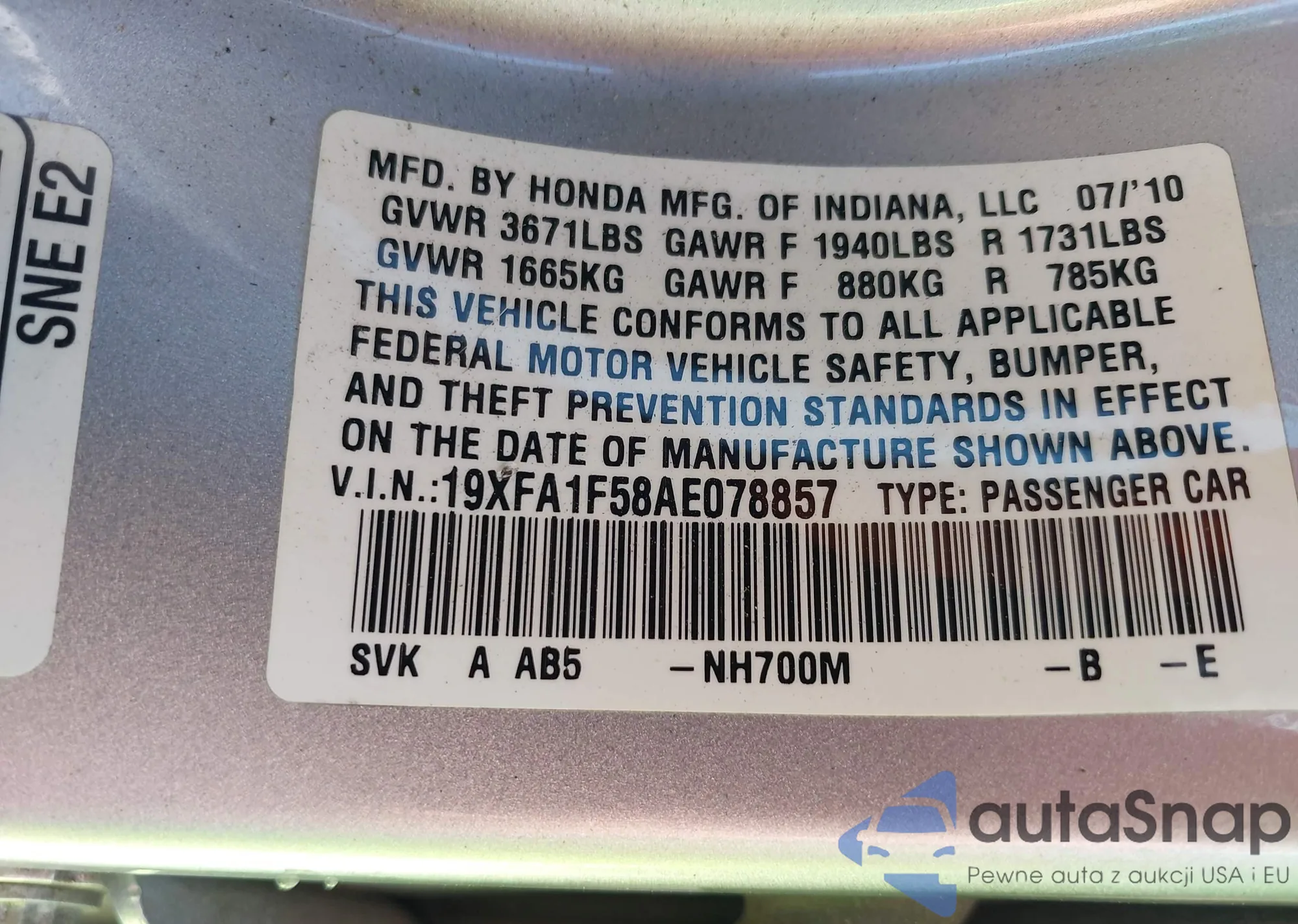 • VIN 19XFA1F58AE078857