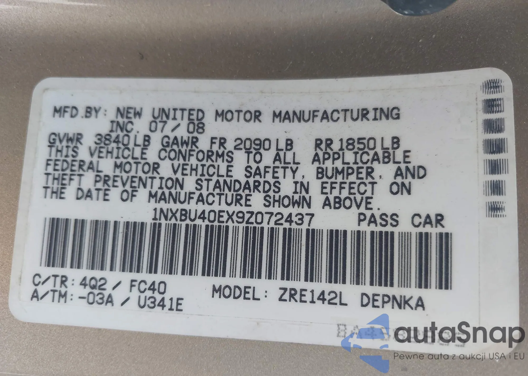 • VIN 1NXBU40EX9Z072437