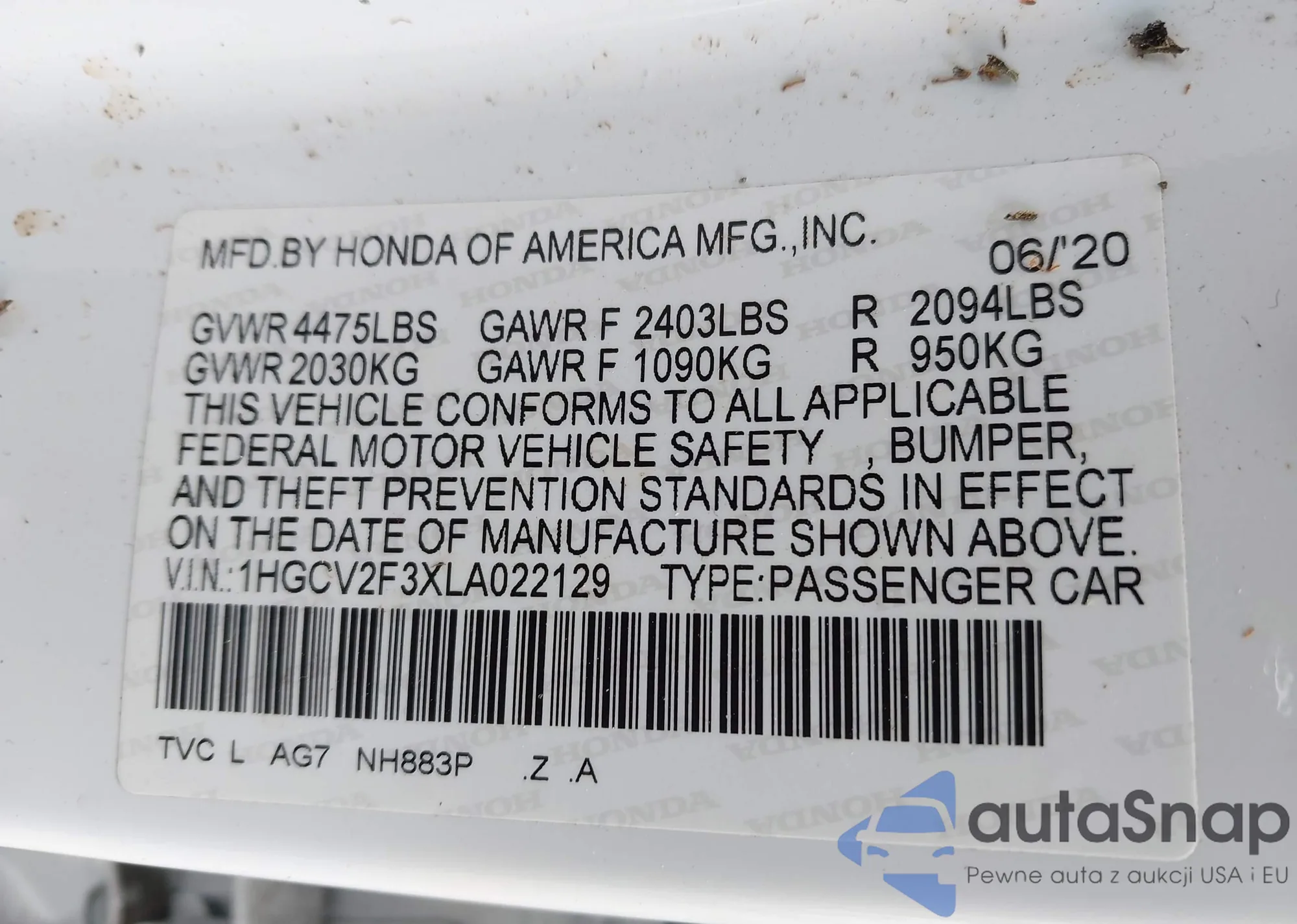 LOT: 41501295 VIN: 1HGCV1F15MA120351