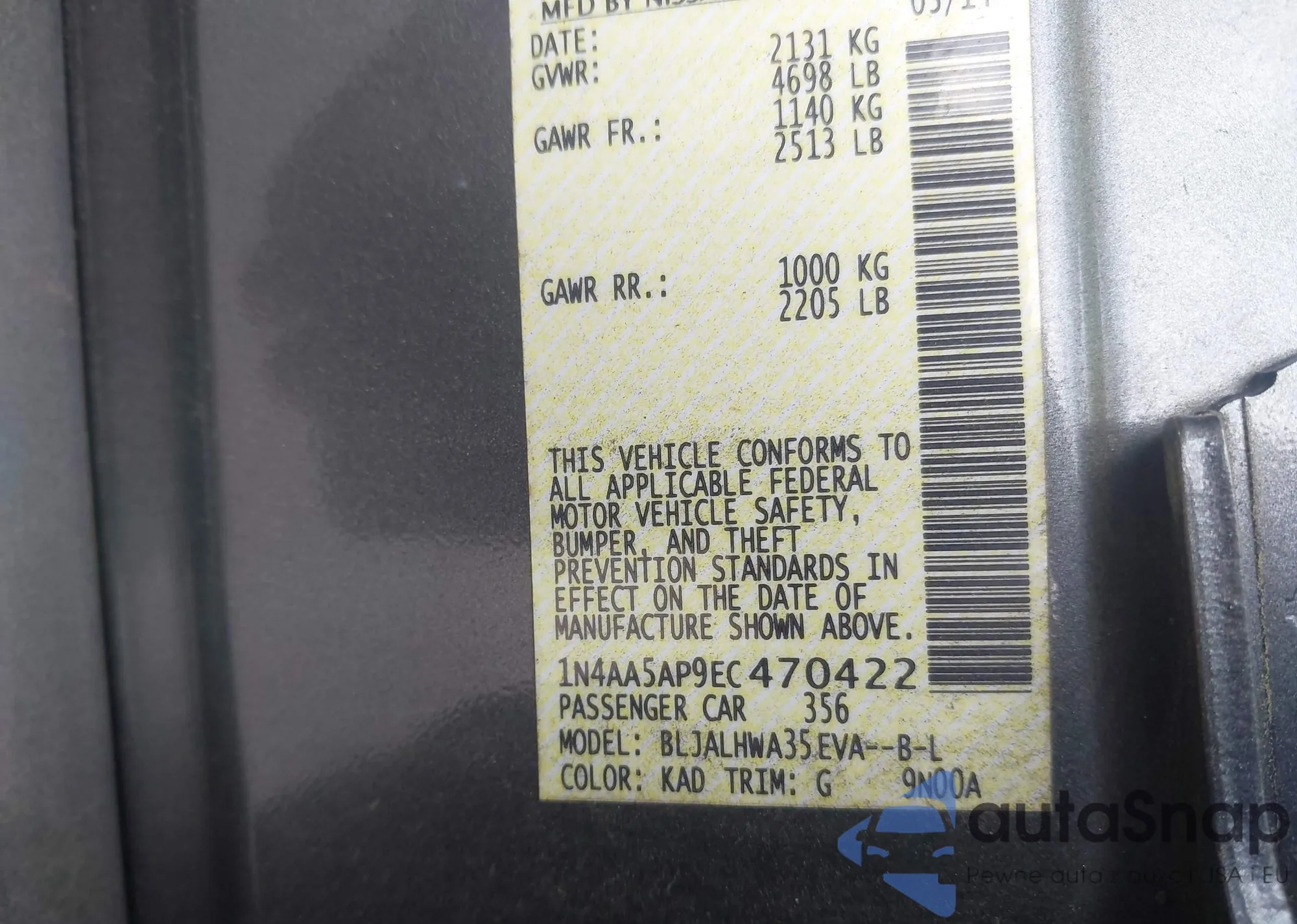 • VIN 1N4AA5AP9EC470422