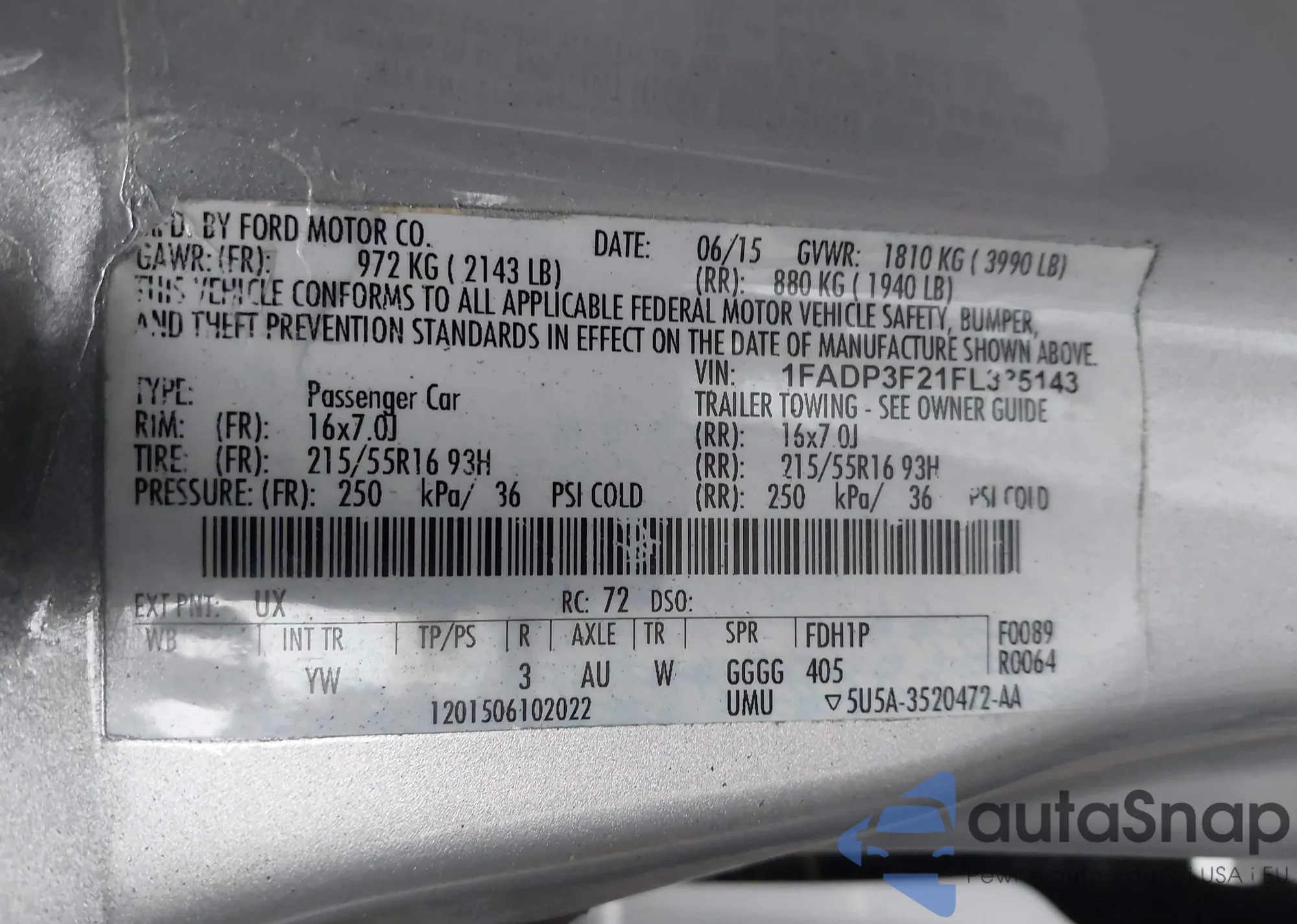 LOT: 42338693 VIN: 1FADP3F21FL335143