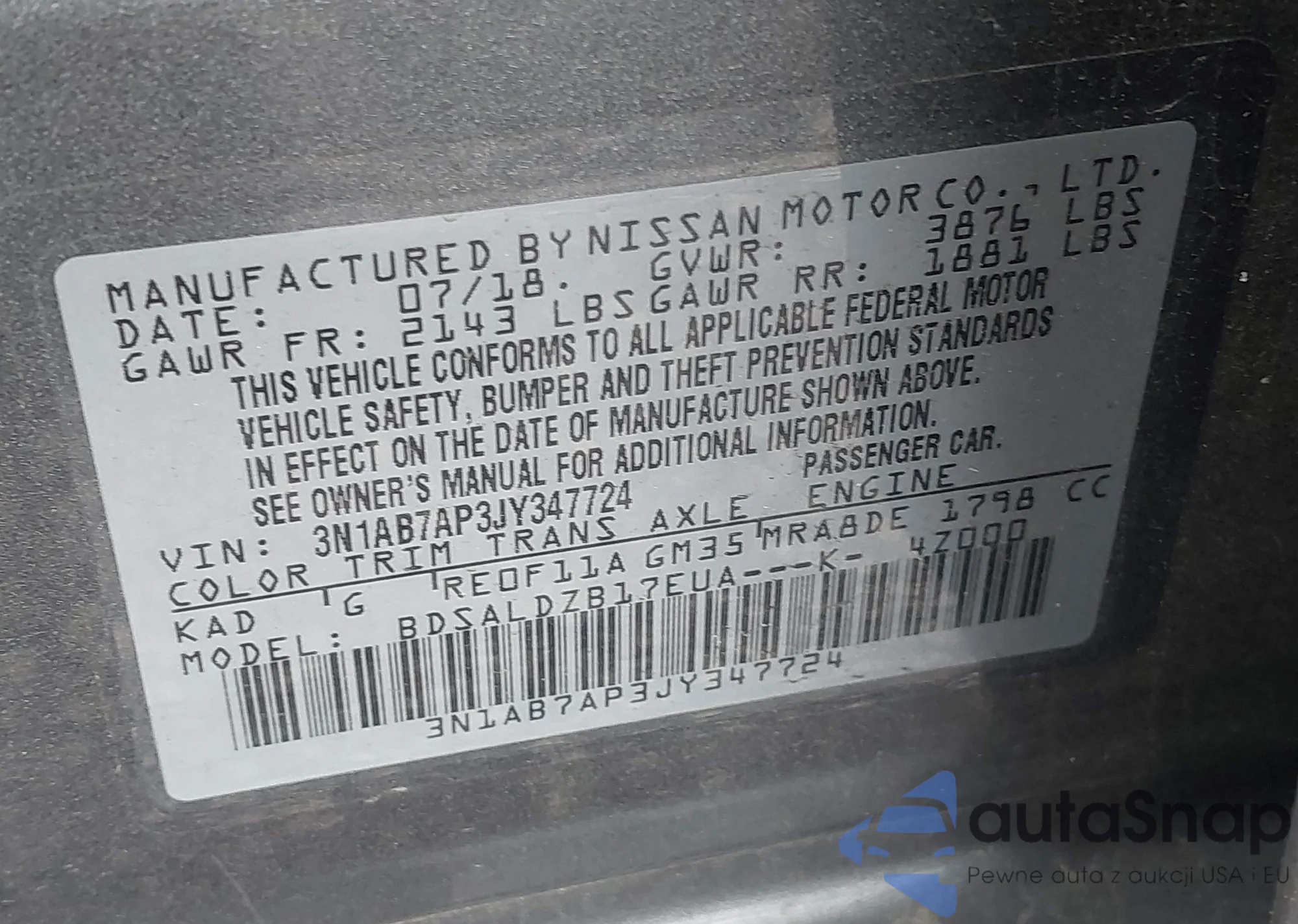 LOT: 42203299 VIN: 3N1AB7AP3JY347724
