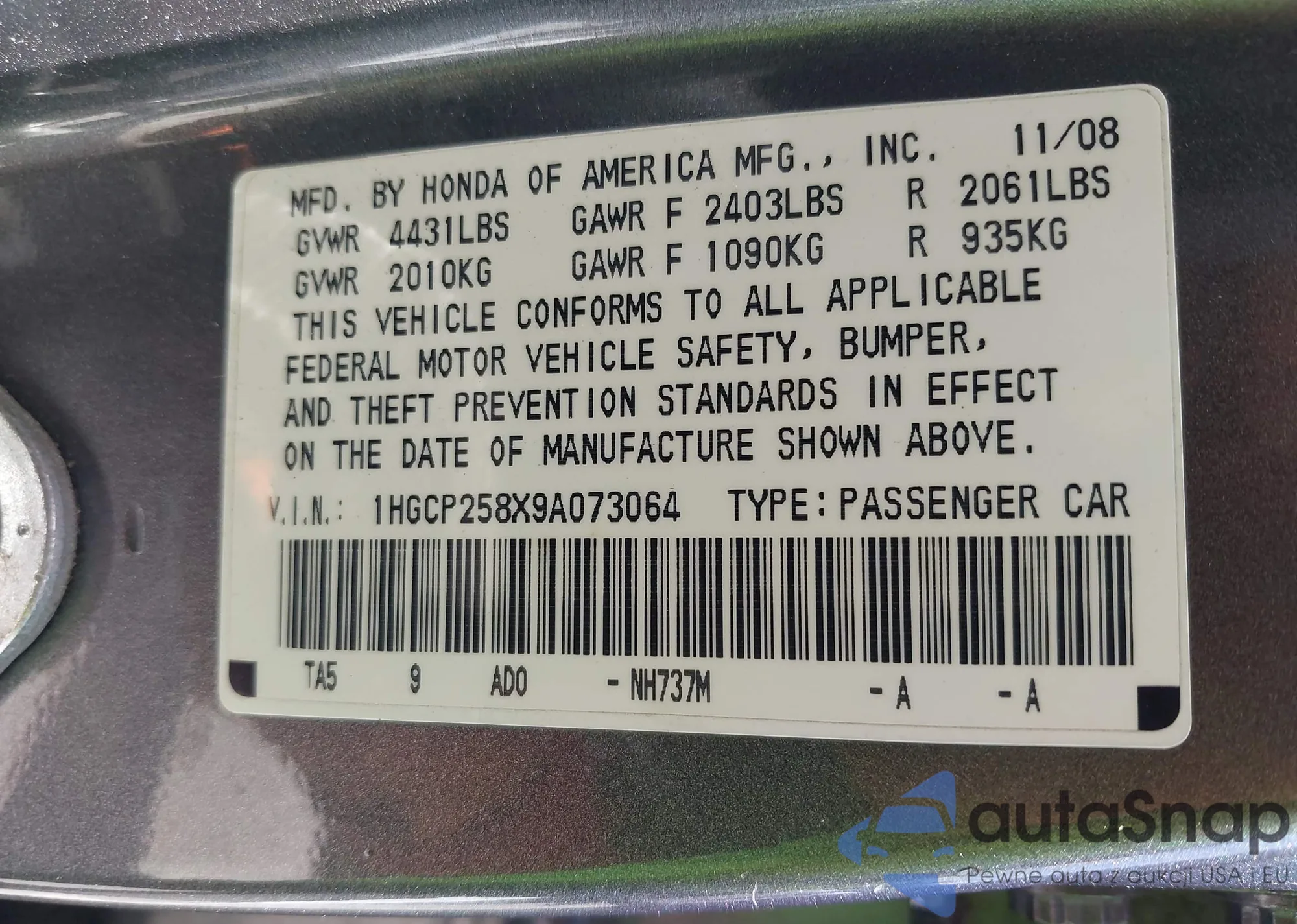 LOT: 42352820 VIN: 1HGCP258X9A073064