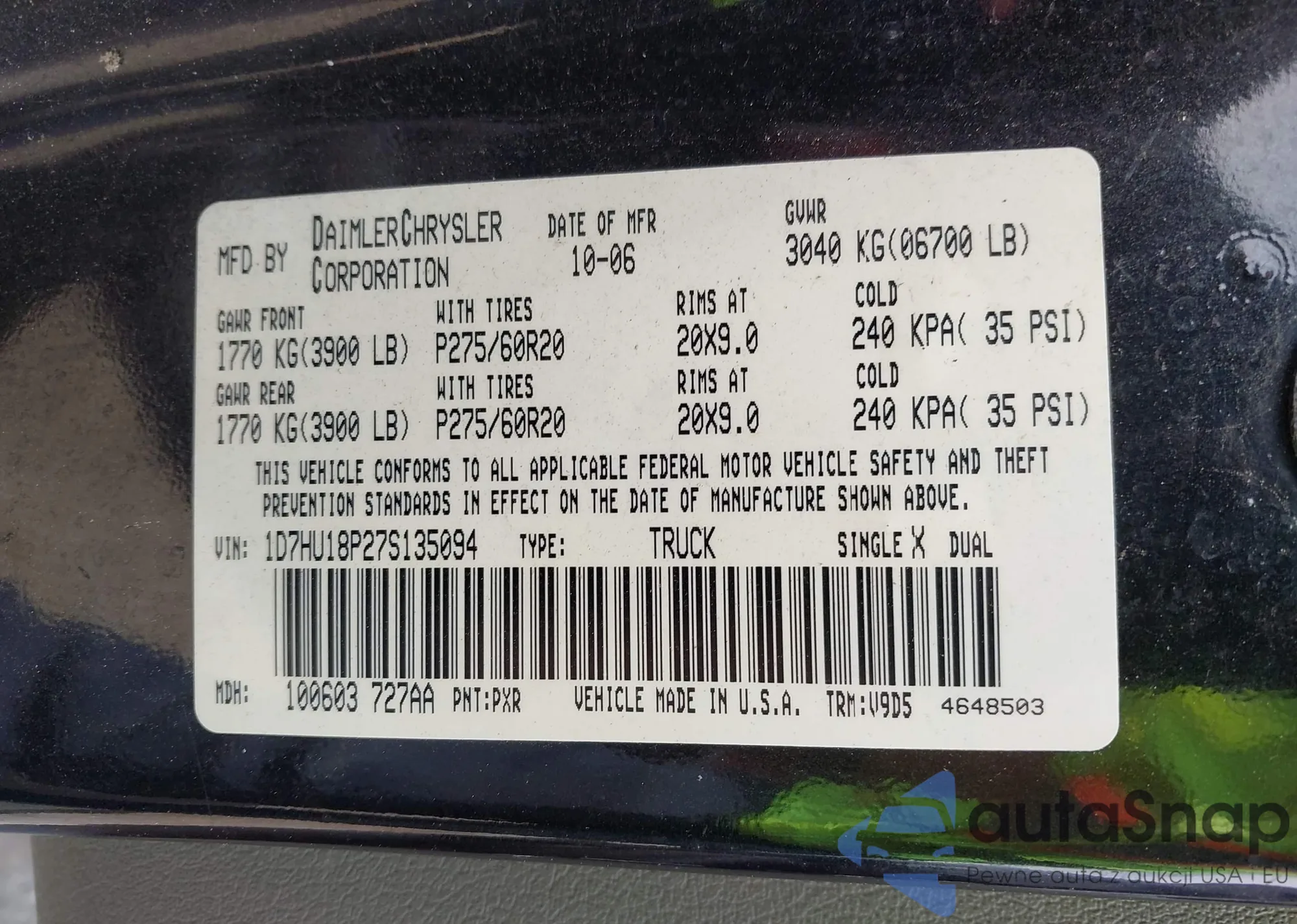 LOT: 42320474 VIN: 1D7HU18P27S135094