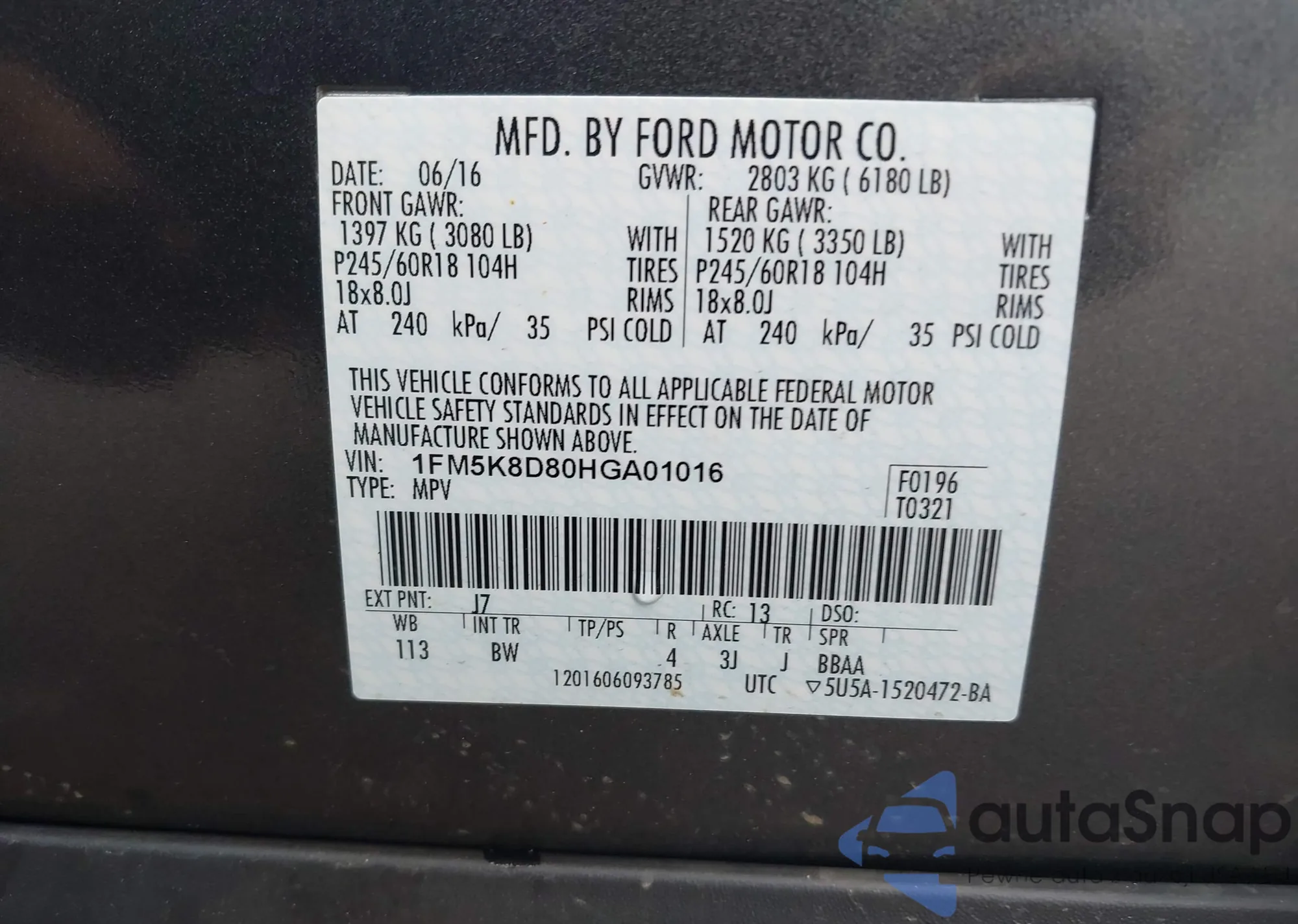 • VIN 1FM5K7B80HGB30645