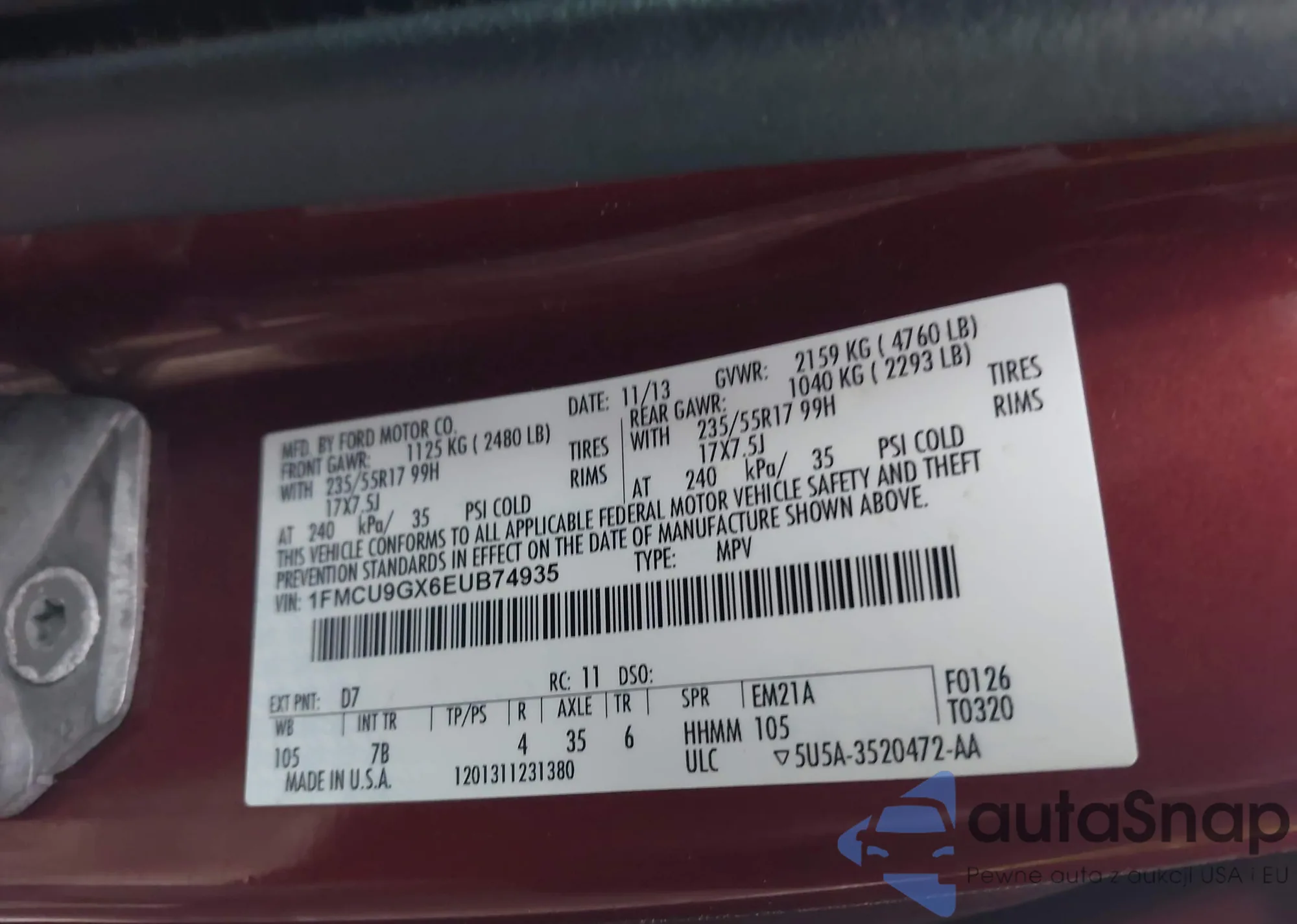 • VIN 1FMCU9GX6EUB74935