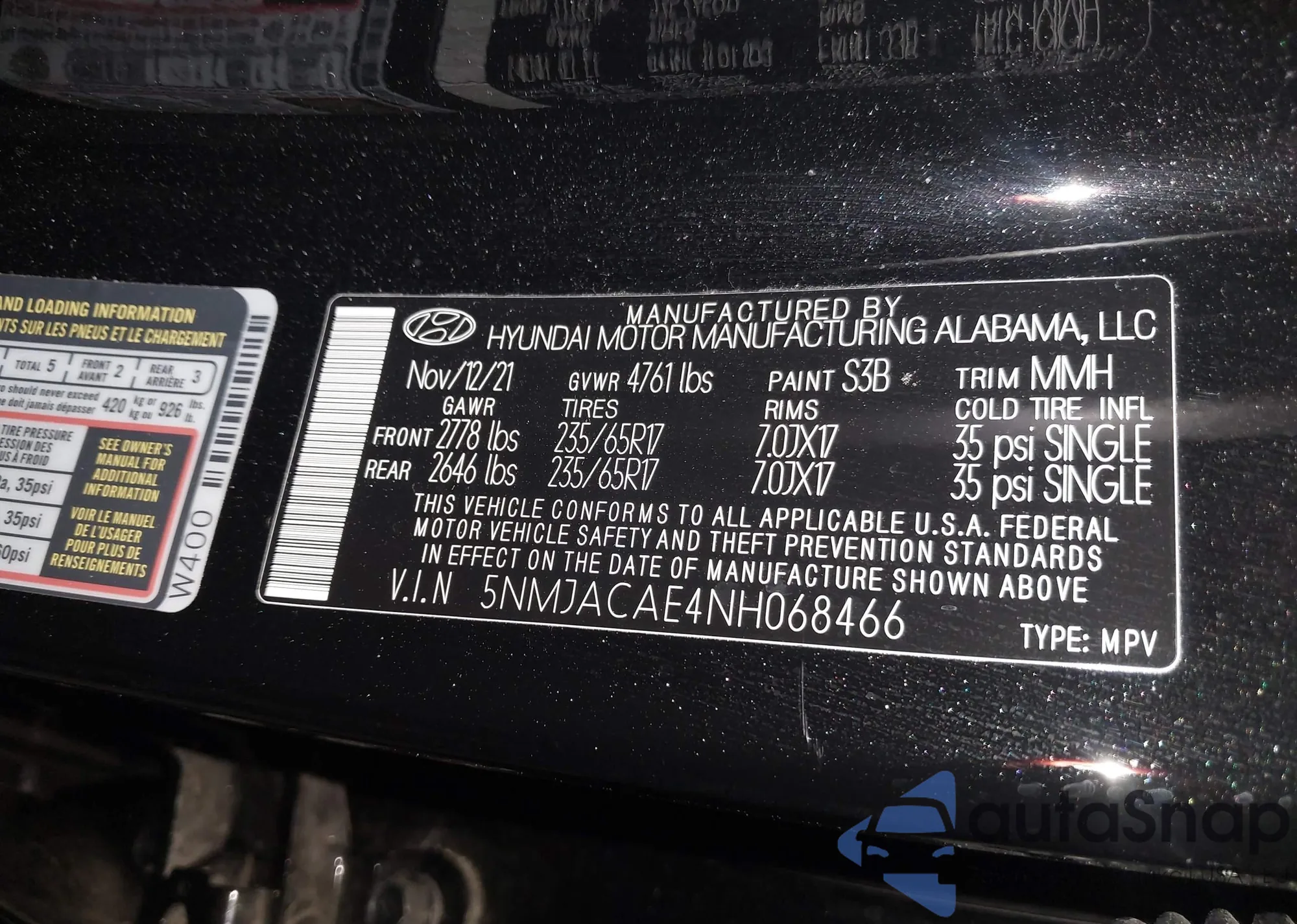 • VIN 5NMJACAE4NH068466