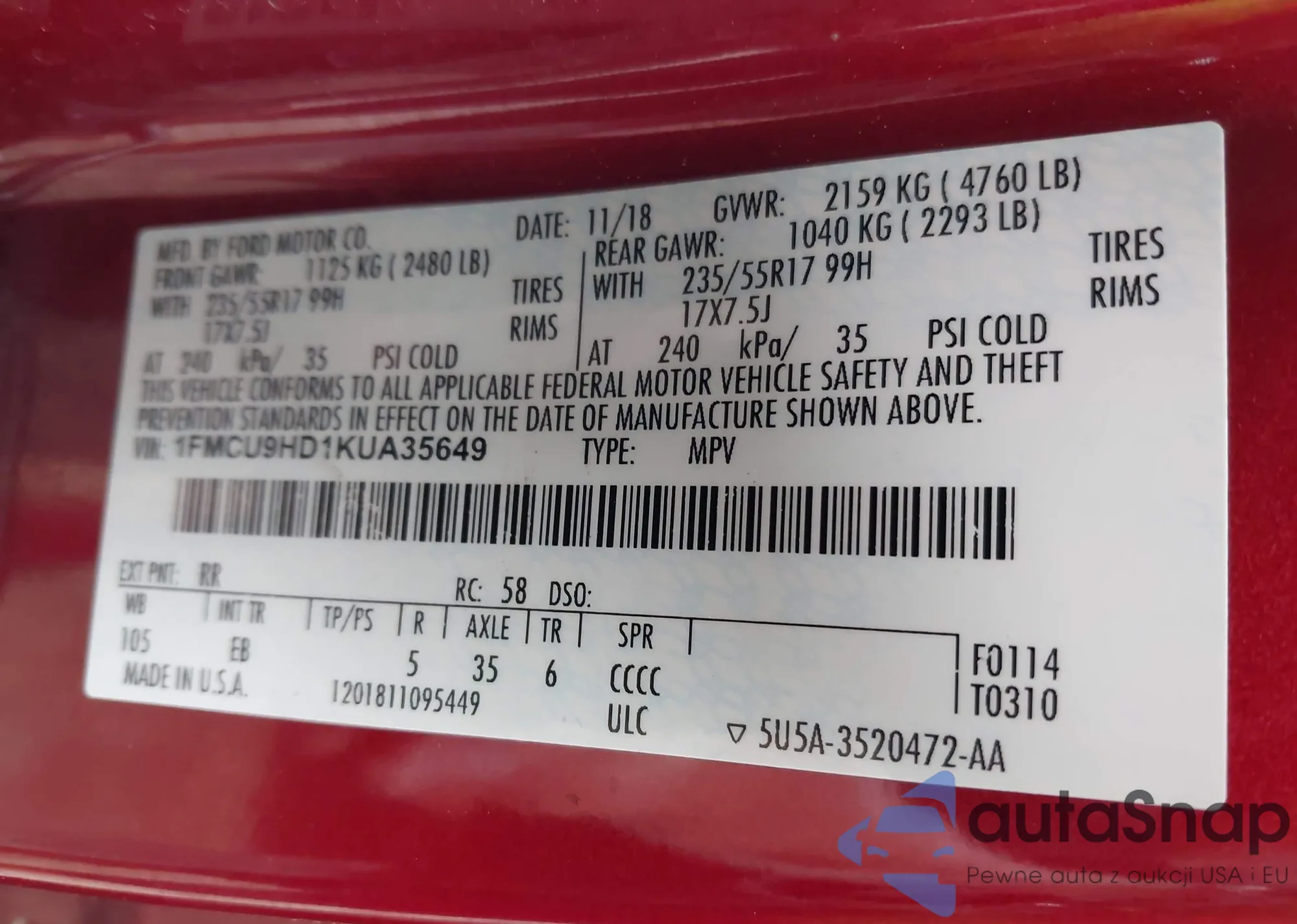 • VIN 1FMCU9HD1KUA35649