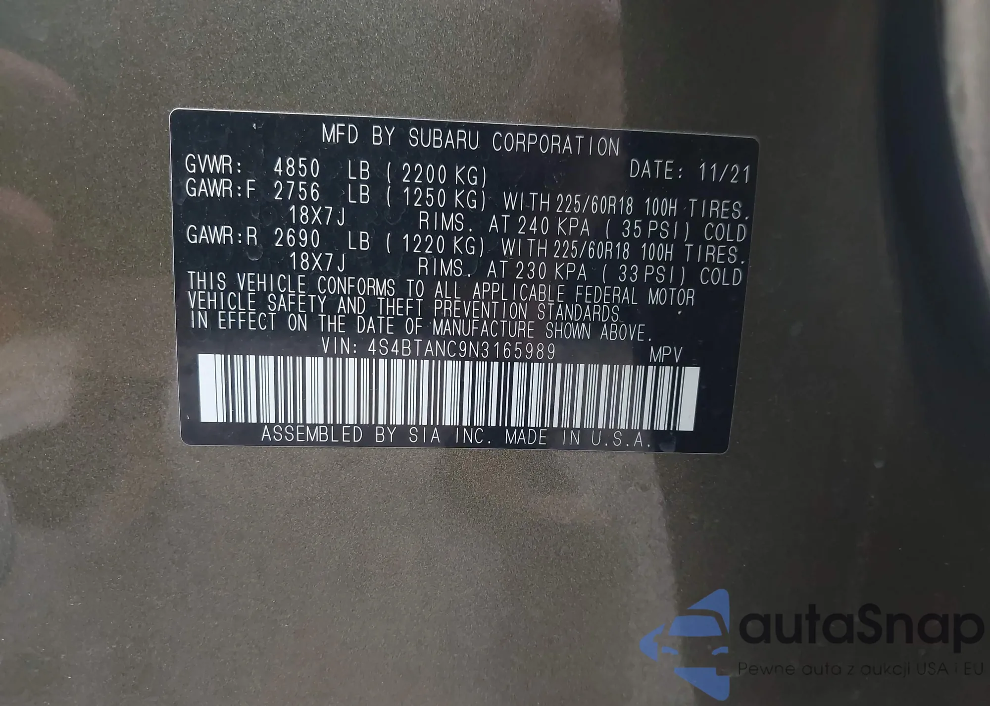 LOT: 42076365 VIN: 4S4BTANC9N3165989